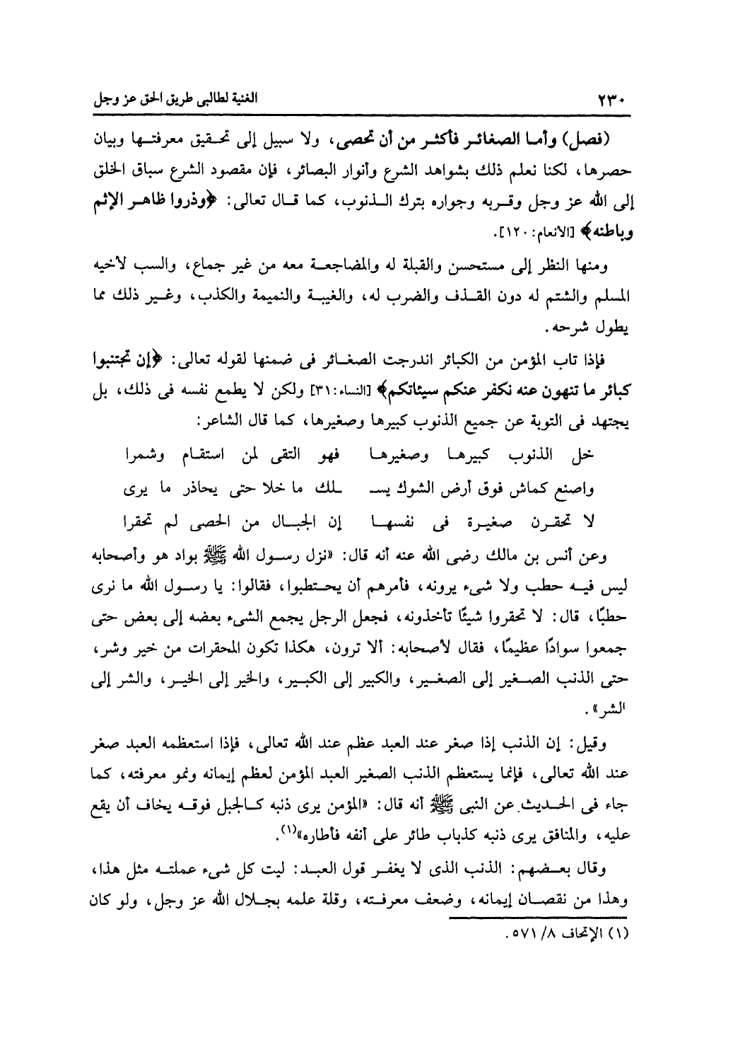 (فصل) وأما الصغائر فأكثر من أن تحصى، ولا سبيل إلى تحقيق معرفتها وبيان حصرها، لكنا نعلم ذلك بشواهد الشرع وأنوار البصائر، فإن مقصود الشرع سباق الخلق إلى الله -عز وجل- وقربه وجواره بترك الذنوب، كما قال تعالى: {وذروا ظاهر الإثم وباطنه} [الأنعام: 120].