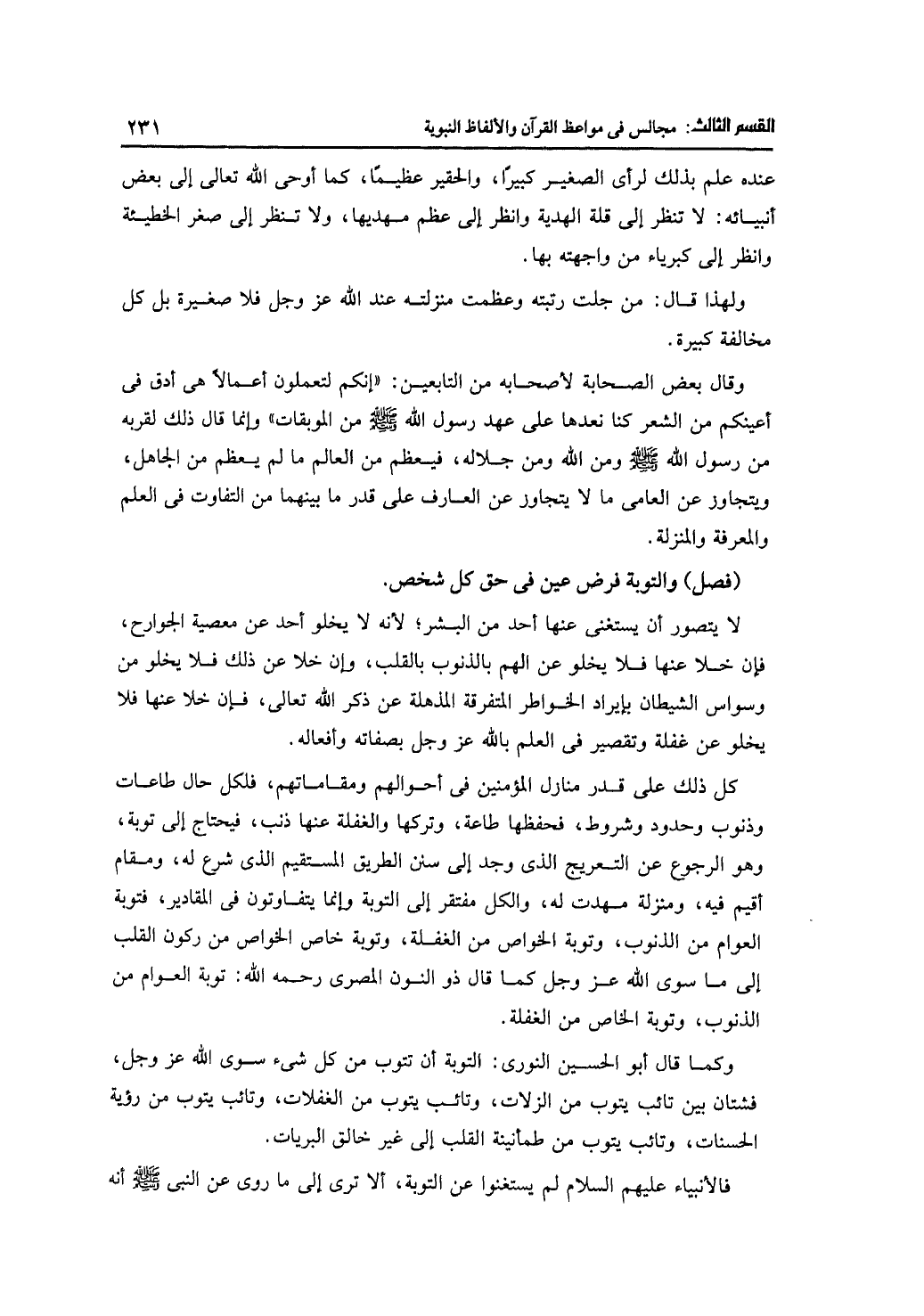 كل ذلك على قدر منازل المؤمنين في أحوالهم ومقاماتهم، فلكل حال طاعات وذنوب وحدود وشروط، فحفظها طاعة، وتركها والغفلة عنها ذنب، فيحتاج إلى توبة، وهو الرجوع عن التعريج الذي وجد إلى سنن الطريق المستقيم الذي شرع له، ومقام أقيم فيه، ومنزلة مهدت له، والكل مفتقر إلى التوبة وإنما يتفاوتون في المقادير، فتوبة العوام من الذنوب، وتوبة الخواص من الغفلة، وتوبة خاص الخواص من ركون القلب إلى ما سوى الله -عز وجل- كما قال ذو النون المصري -رحمه الله-: توبة العوام من الذنوب، وتوبة الخاص من الغفلة.