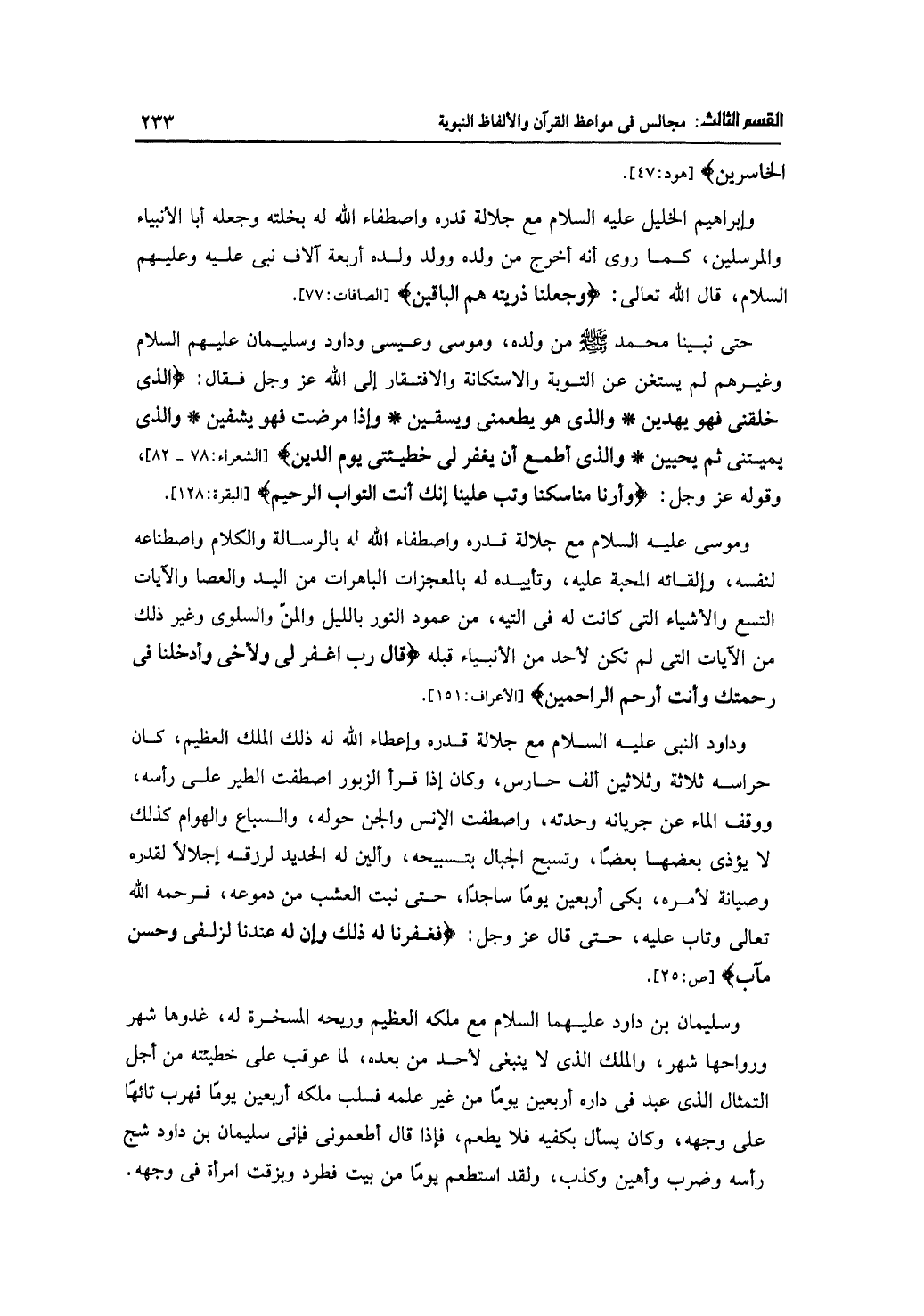 وداود النبي -عليه السلام- مع جلالة قدره وإعطاء الله له ذلك الملك العظيم، كان حراسة ثلاثة وثلاثين ألف حارس، وكان إذا قرأ الزبور اصطفت الطير على رأسه، ووقف الماء عن جريانه وحدته، واصطفت الإنس والجن حوله، والسباع والهوام كذلك لا يؤذي بعضها بعضًا، وتسبح الجبال بتسبيحه، وألين له الحديد لرزقه إجلالًا لقدره وصيانة لأمره، بكى أربعين يومًا ساجدًا، حتى نبت العشب من دموعه، فرحمه الله تعالى وتاب عليه، حتى قال -عز وجل-: {فغفرنا له ذلك وإن له عندنا لزلفى وحسن مآب} [ص: 25].
