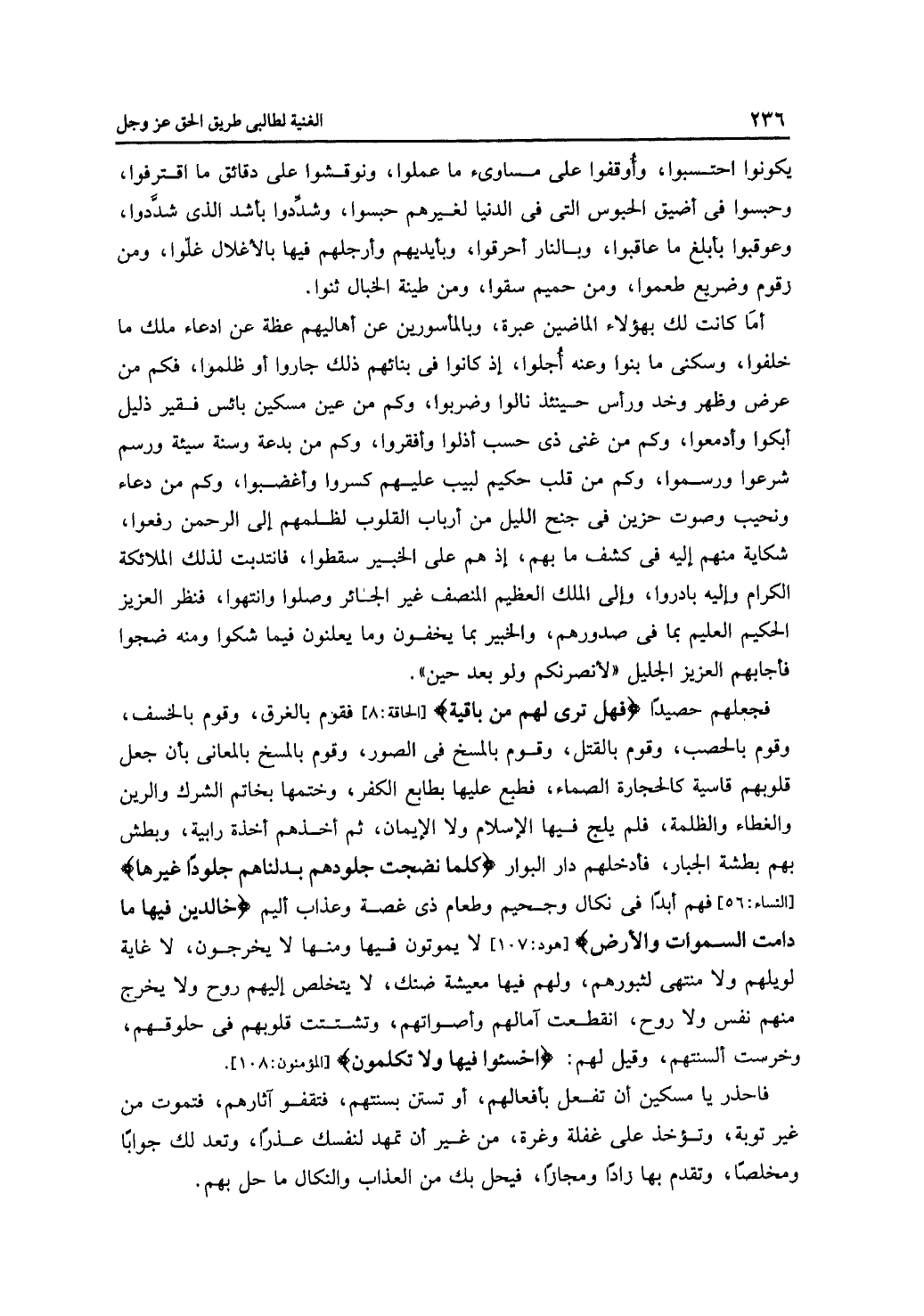 فجعلهم حصيدًا {فهل ترى لهم من باقية} [الحاقة: 8] فقوم بالغرق، وقوم بالخسف، وقوم بالحصب، وقوم بالقتل، وقوم بالمسخ في الصور، وقوم بالمسخ بالمعاني بأن جعل قلوبهم قاسية كالحجارة الصماء، فطبع عليها بطابع الكفر، وختمها بخاتم الشرك والرين والغطاء والظلمة، فلم يلج فيها الإسلام ولا الإيمان، ثم أخذهم أخذة رابية، وبطش بهم بطشة الجبار، فأدخلهم دار البوار {كلما نضجت جلودهم بدلناهم جلودًا غيرها} [النساء: 56] فهم أبدًا في نكال وجحيم وطعام ذي غصة وعذاب أليم {خالدين فيها ما دامت السموات والأرض} [هود: 107] لا يموتون فيها ومنها لا يخرجون، لا غاية لويلهم ولا منتهى لثبورهم، ولهم فيها معيشة ضنك، لا يتخلص إليهم روح ولا يخرج منهم نفس ولا روح، انقطعت آمالهم وأصواتهم، وتشتت قلوبهم في حلوقهم، وخرست ألسنتهم، وقيل لهم: {اخسئوا فيها ولا تكلمون} [المؤمنون: 108].