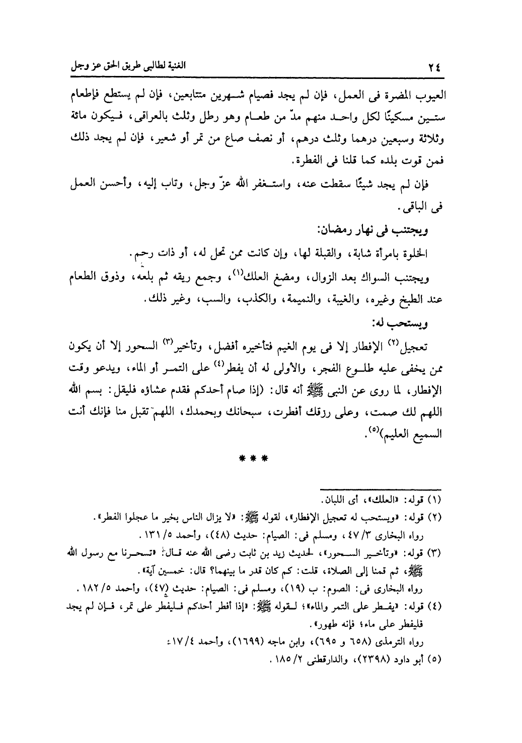 تعجيل الإفطار إلا في يوم الغيم فتأخيره أفضل، وتأخير السحور إلا أن يكون ممن يخفى عليه طلوع الفجر، والأولى له أن يفطر على التمر أو الماء، ويدعو وقت الإفطار، لما روي عن النبي -صلى الله عليه وسلم- أنه قال: (إذا صام أحدكم فقدم عشاؤه فليقل: بسم الله اللهم لك صمت، وعلى رزقك أفطرت، سبحانك وبحمدك، اللهم تقبل منا فإنك أنت السميع العليم).