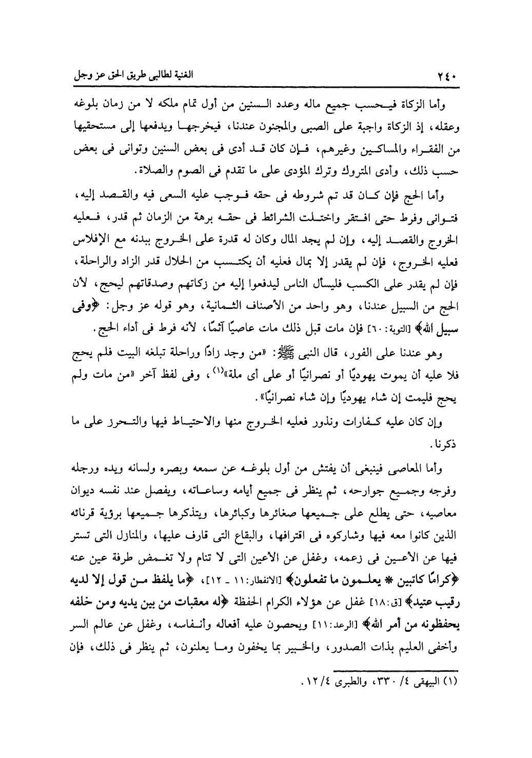 وأما المعاصي فينبغي أن يفتش من أول بلوغه عن سمعه وبصره ولسانه ويده ورجله وفرجه وجميع جوارحه، ثم ينظر في جميع أيامه وساعاته، ويفصل عند نفسه ديوان معاصيه، حتى يطلع على جميعها صغائرها وكبائرها، ويتذكرها جميعها برؤية قرنائه الذين كانوا معه فيها وشاركوه في اقترافها، والبقاع التي قارف عليها، والمنازل التي تستر فيها عن الأعين في زعمه، وغفل عن الأعين التي لا تنام ولا تغمض طرفة عين عنه {كراما كاتبين* يعلمون ما تفعلون} [الانفطار: 11 - 12]، {ما يلفظ من قول إلا لديه رقيب عتيد} [ق:18] غفل عن هؤلاء الكرام الحفظة {له معقبات من بين يديه ومن خلفه يحفظونه من أمر الله} [الرعد: 11] ويحصون عليه أفعاله وأنفاسه، وغفل عن عالم السر وأخفى العليم بذات الصدور، والخبير بما يخفون وما يعلنون، ثم ينظر في ذلك، فإن