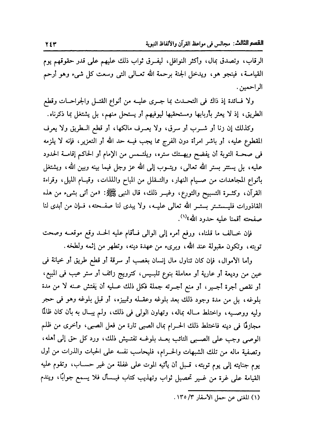 ولا فائدة إذ ذاك في التحدث بما جرى عليه من أنواع القتل والجراحات وقطع الطريق، إذ لا يعثر بأربابها ومستحقيها ليوفيهم أو يستحل منهم، بل يشتغل بما ذكرناه. وكذلك إن زنا أو شرب أو سرق، ولا يعرف مالكها، أو قطع الطريق ولا يعرف المقطوع عليه، أو باشر امرأة دون الفرج مما يجب فيه حد الله أو التعزيز، فإنه لا يلزمه في صحة التوبة أن يفضح ويهتك ستره، ويلتمس من الإمام أو الحاكم إقامة الحدود عليه، بل يستتر بستر الله تعالى، وينوب إلى الله عز وجل فيما بينه وبين الله، ويستغل بأنواع المجاهدات من صيام النهار، والتقلل من المباح واللذات، وقيام الليل، وقراءة القرآن وكثرة التسبيح والتورع، وفير ذلك، قال النبي -صلى الله عليه وسلم-: "من أتى بشيء من هذه القاذورات فليستتر بستر الله تعالى عليه، ولا يبدي لنا صفحته، فإن من أبدى لنا صفحته أقمنا عليه حدود الله".