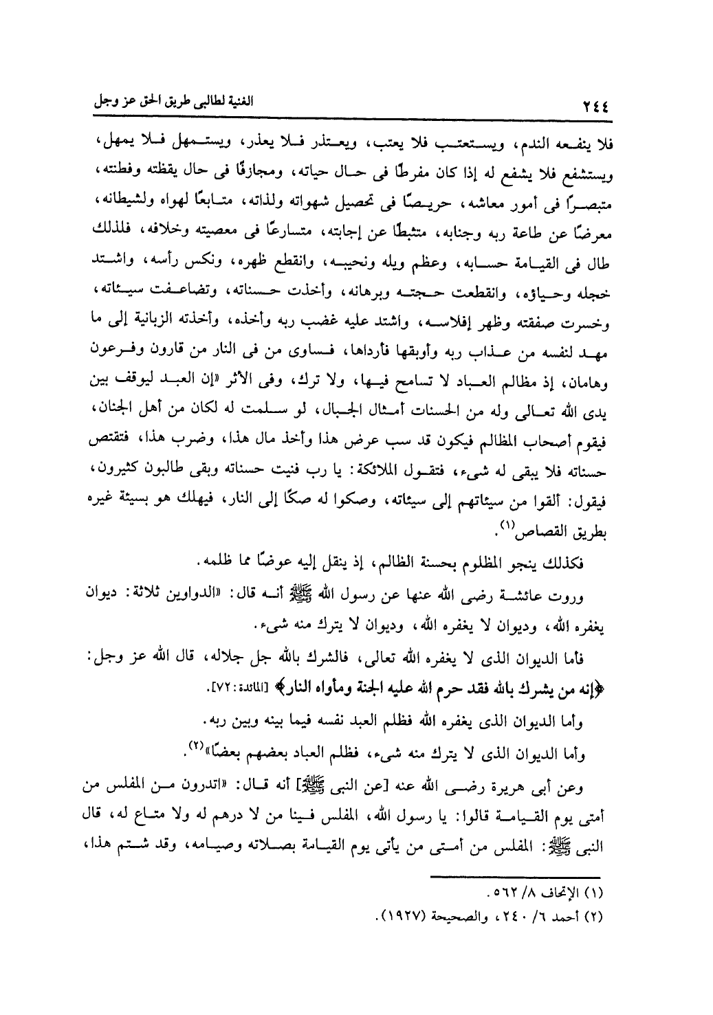 فلا ينفعه الندم، ويستعتب فلا يعتب، ويعتذر فلا يعذر، ويستمهل فلا يمهل، ويستشفع فلا يشفع له إذا كان مفرطًا في حال حياته، ومجازفًا في حال يقظته وفطنته، متبصرًا في أمور معاشه، حريصًا في تحصيل شهواته ولذاته، متابعًا لهواه ولشيطانه، معرضًا عن طاعة ربه وجنابة، منبثطًا عن إجابته، متسارعًا في معصيته وخلافه، فلذلك طال في القيامة حسابه، وعظم ويله ونحيبه، وانقطع ظهره، ونكس رأسه، واشتد خجله وحياؤه، وانقطعت حجته وبرهانه، وأخذت حسناته، وتضاعفت سيئاته، وخسرت صفقته وظهر إفلاسه، واشتد عليه غضب ربه ويأخذه، وأخذته الزبانية إلى ما مهد لنفسه من عذاب ربه وأوبقها فأرداها، فساوى من في النار من قارون وفرعون وهامان، إذ مظالم العباد لا تسامح فيها، ولا ترك، وفي الأثر "إن العبد ليوقف بين يدي الله تعالى وله من الحسنات أمثال الجبال، لو سلمت له لكان من أهل الجنان، فيقوم أصحاب المظالم فيكون قد سب عرض هذا وأخذ مال هذا، وضرب هذا، فتقتص حسناته فلا يبقى له شيء، فتقول الملائكة: يارب فنيت حسناته وبقى طالبون كثيرون، فيقول: ألقوا من سيئاتهم إلى سيئاته، وصكوا له صكًا إلى النار، فيهلك هو بسيئة غيره بطريق القصاص.