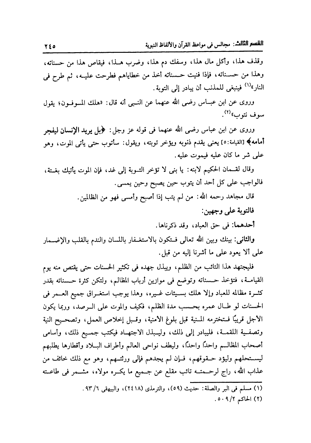 وقذف هذا، وأكل مال هذا، وسفك دم هذا، وضرب هذا، فيقاص هذا من حسناته، وهذا من حسناته فإذا فنيت حسناته أخذ من خطاياهم فطرحت عليه، ثم طرح في النار» فينبغي للمذنب أن يبادر إلى التوبة.