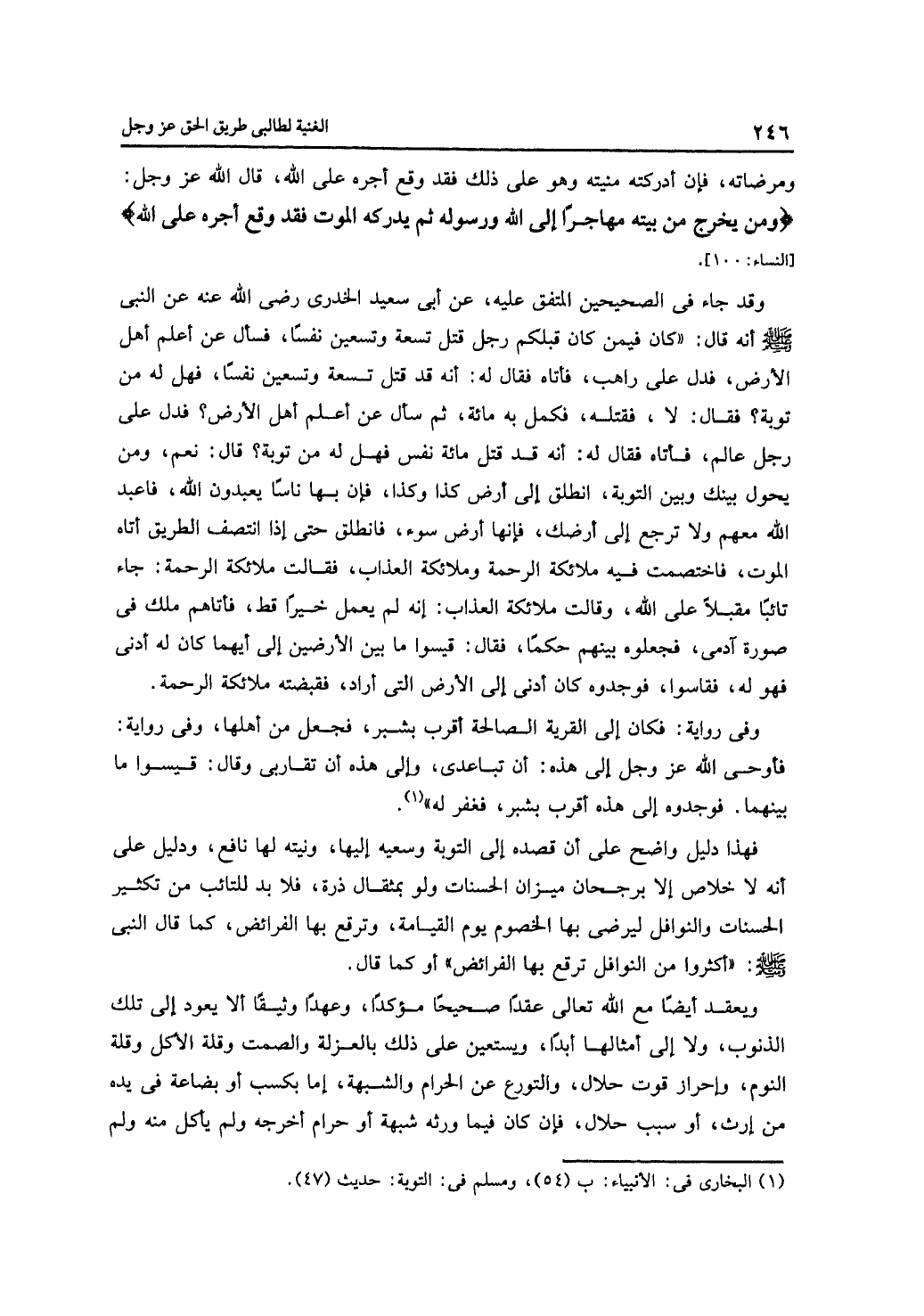 وقد جاء في الصحيحين المتفق عليه، عن أبي سعيد الخدري رضي الله عنه عن النبي -صلى الله عليه وسلم- أنه قال: "كان فيمن كان قبلكم رجل قتل تسعة وتسعين نفسًا، فسأل عن أعلم أهل الأرض، فدل على راهب، فأتاه فقال له: أنه قد قتل تسعة وتسعين نفسًا، فهل له من توبة؟ فقال: لا، فقتله، فكمل به مائة، ثم سأل عن أعلم أهل الأرض؟ فدل على رجل عالم، فأتاه فقال له: أنه قد قتل مائة نفس فهل له من توبة؟ قال: نعم، ومن يحول بينك وبين التوبة، انطلق إلى أرض كذا وكذا، فإن بها ناسًا يعبدون الله، فأعبد الله معهم ولا ترجع إلى أرضك، فإنها أرض سوء، فانطلق حتى إذا انتصف الطريق أتاه الموت، فاختصمت فيه ملائكة الرحمة وملائكة العذاب، فقال ملائكة الرحمة: جاء تائبًا مقبلًا على الله، وقالت ملائكة العذاب: إنه لم يعمل خيرًا قط، فأتاهم ملك في صورة آدمي، فجعلوه بينهم حكًا، فقال: قيسوا ما بين الأرضيين إلى أيهما كان أدنى فهو له، فقاسوا، فوجدوه وكان أدنى إلى الأرض التي أراد، فقبضته ملائكة الرحمة.