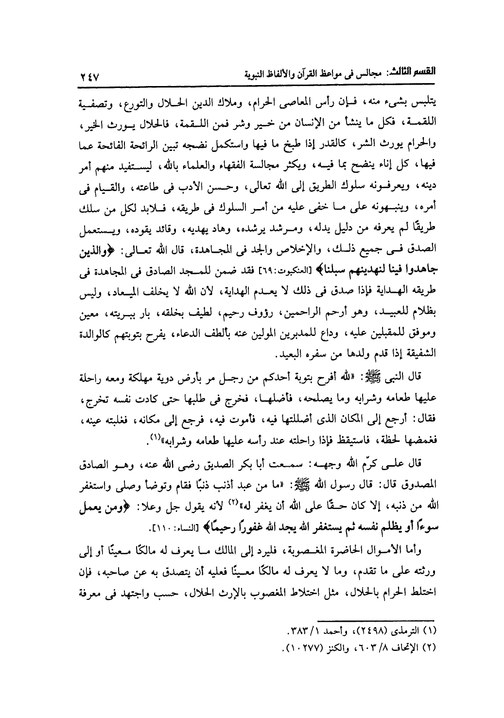 يتلبس بشيء منه، فإن رأس المعاصي الحرام، وملاك الدين الحلال والتورع، وتصفية اللقمة، فكل ما ينشأ من الإنسان من خير وشر فمن اللقمة، فالحلال يورث الخير، والحرام يورث الشر، كالقدر إذا طبخ ما فيها واستكمل نضجه تبين الرائحة الفائحة عما فيها، كل إناء ينضح بما فيه، ويكثر مجالسة الفقهاء والعلماء بالله، ليستفيد منهم أمر دينه، ويعرفونه سلوك الطريق إلى الله تعالى، وحسن الأدب في طاعته، والقيام في أمره، وينبهونه على ما خفي عليه من أمر السلوك في طريقه، فلا بد لكل من سلك طريقًا لم يعرفه من دليل يدله، ومرشد يرشده، وهاد يهديه، وقائد يقوده، وستعمل الصدق في جميع ذلك، والإخلاص والجد في المجاهدة، قال الله تعالى: {والذين جاهدوا فينا لنهدينهم سبلنا} [العنكبوت: 96] فقد ضمن للمجد الصادق في المجاهدة في طريقه الهداية فإذا صدق في ذلك لا يعدم الهداية، لأن الله لا يخلف الميعاد، وليس بظلام للعبيد، وهو أرحم الراحمين، رءوف رحيم، لطيف بخلقه، بار ببريته، معين وموفق للمقبلين عليه، وداع للمدبرين المولين عنه بألطف الدعاء، يفرح بتوبتهم كالوالدة الشفيقة إذا قدم ولدها من سفره البعيد.