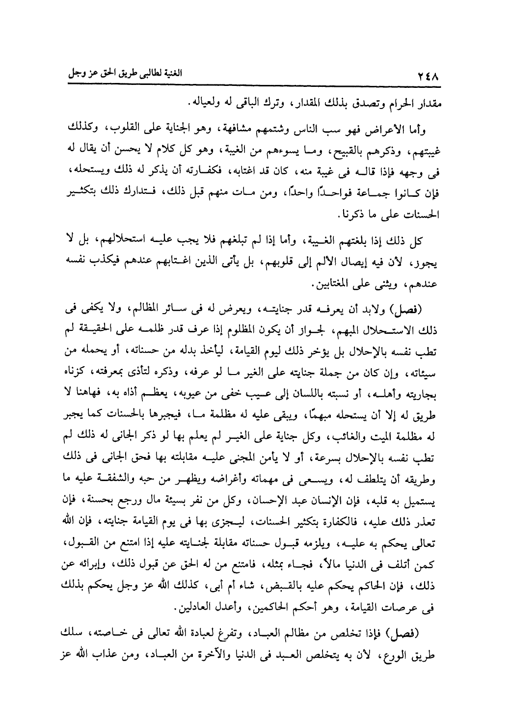 وأما الأعراض فهو سب الناس وشتمهم مشافهة، وهو الجناية على القلوب، وكذلك غيبتهم، وذكرهم بالقبيح، وما يسوءهم من الغيبة، وهو كل كلام لا يحسن أن يقال له في وجهه فإذا قاله في غيبه منه، كان قد اغتابه، فكفارته أن يذكر له ذلك ويستحله، فإن كانوا جماعة فواحدًا واحدًا، ومن مات منهم قبل ذلك، فتدارك ذلك بكثير الحسنات على ما ذكرناه.