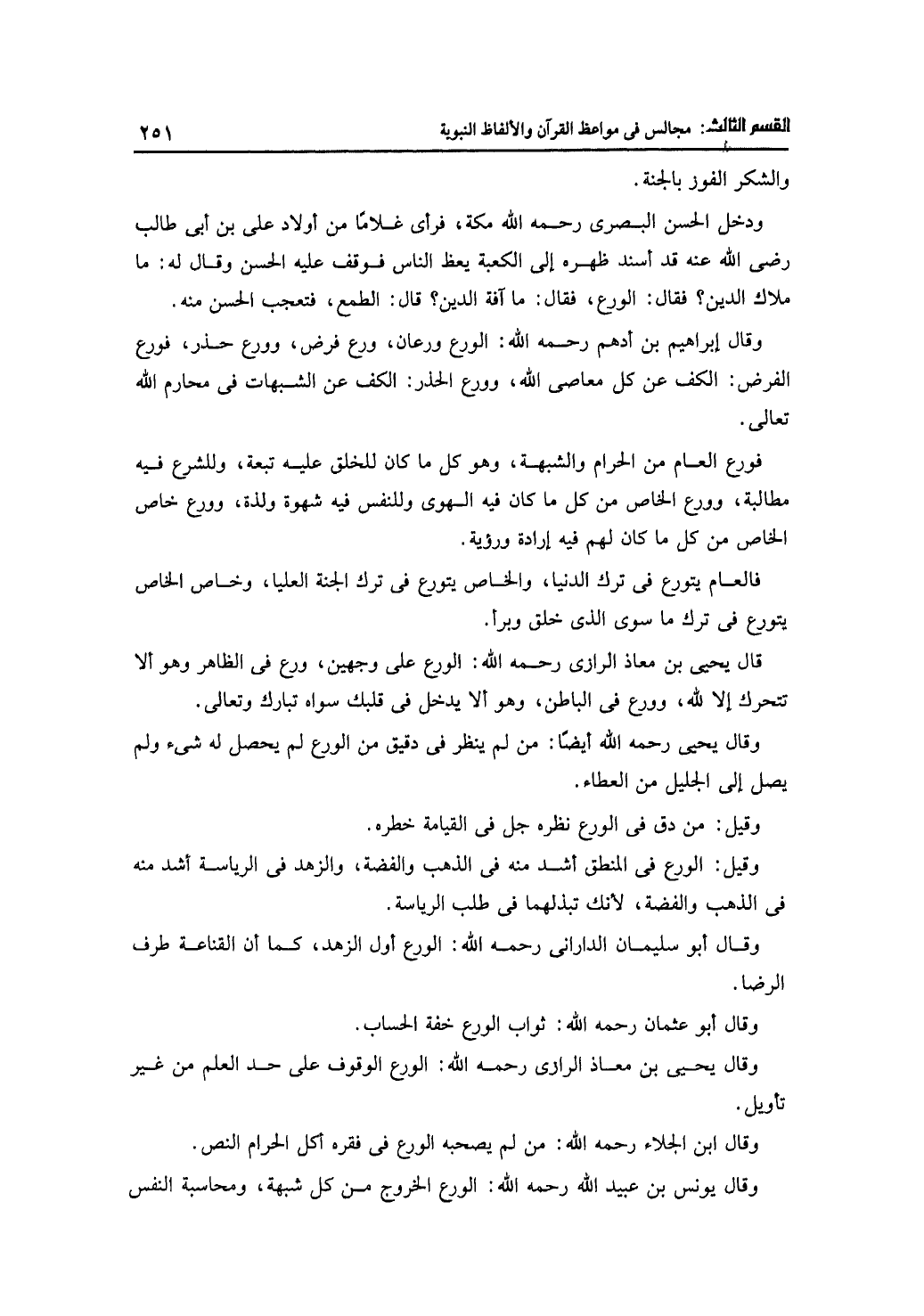 فورع العام من الحرام والشبهة، وهو كل ما كان للخلق عليه تبعة، وللشرع فيه مطالبه، وورع الخاص من كل ما كان فيه الهوى وللنفس فيه شهوة ولذة، وورع خاص الخاص من كل ما كان لهم فيه إرادة ورؤية.