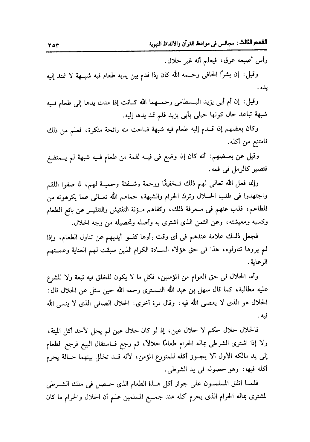 وإنما فعل الله تعالى لهم ذلك تخفيفًا ورحمه وشفقة وحمية لهم، لما صفوا اللقم واجتهدوا في طلب الحلال وترك الحرام والشبهة، حماهم الله تعالى عما يكرهونه من المطاعم، فذب عنهم في معرفة ذلك، وكفاهم مؤنه التفتيش والتنقير عن بائع الطعام وكسبه ومعيشته، وعن الثمن الذي اشترى به وأصله وتحصيله من وجه الحلال.