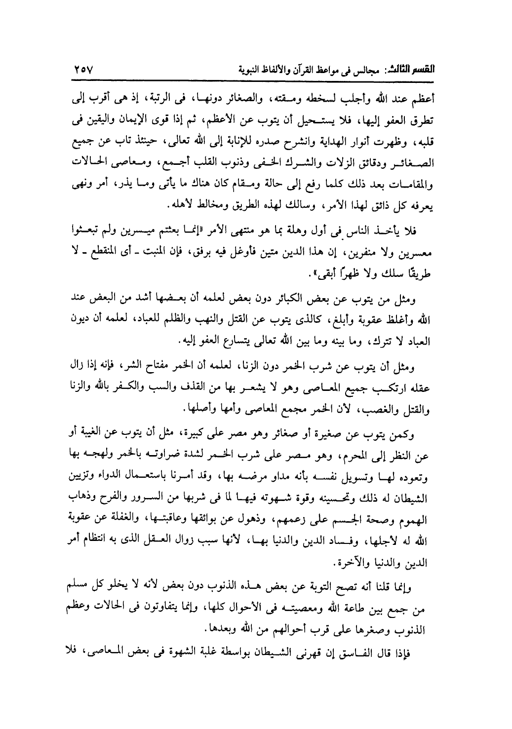 أعظم عند الله وأجلب لسخطه ومقته، والصغائر دونها، في الرتبة، إذ هي أقرب إلى تطرق العفو إليها، فلا يستحيل أن يتوب عن الأعظم، ثم إذا قوى الإيمان واليقين في قلبه، وظهرت أنوار الهداية وانشراح صدره للإنابة إلى الله تعالى، حينئذ تاب عن جميع الصغائر ودقائق الزلات والشرك الخفي وذنوب القلب أجمع، ومعاصي الحالات والمقامات بعد ذلك كلما رفع إلى حالة ومقام كان هناك ما يأتي وما يذر، أمر ونهى يعرفه كل ذائق لهذا الأمر، وسالك لهذه الطريق ومخالط لأهله.