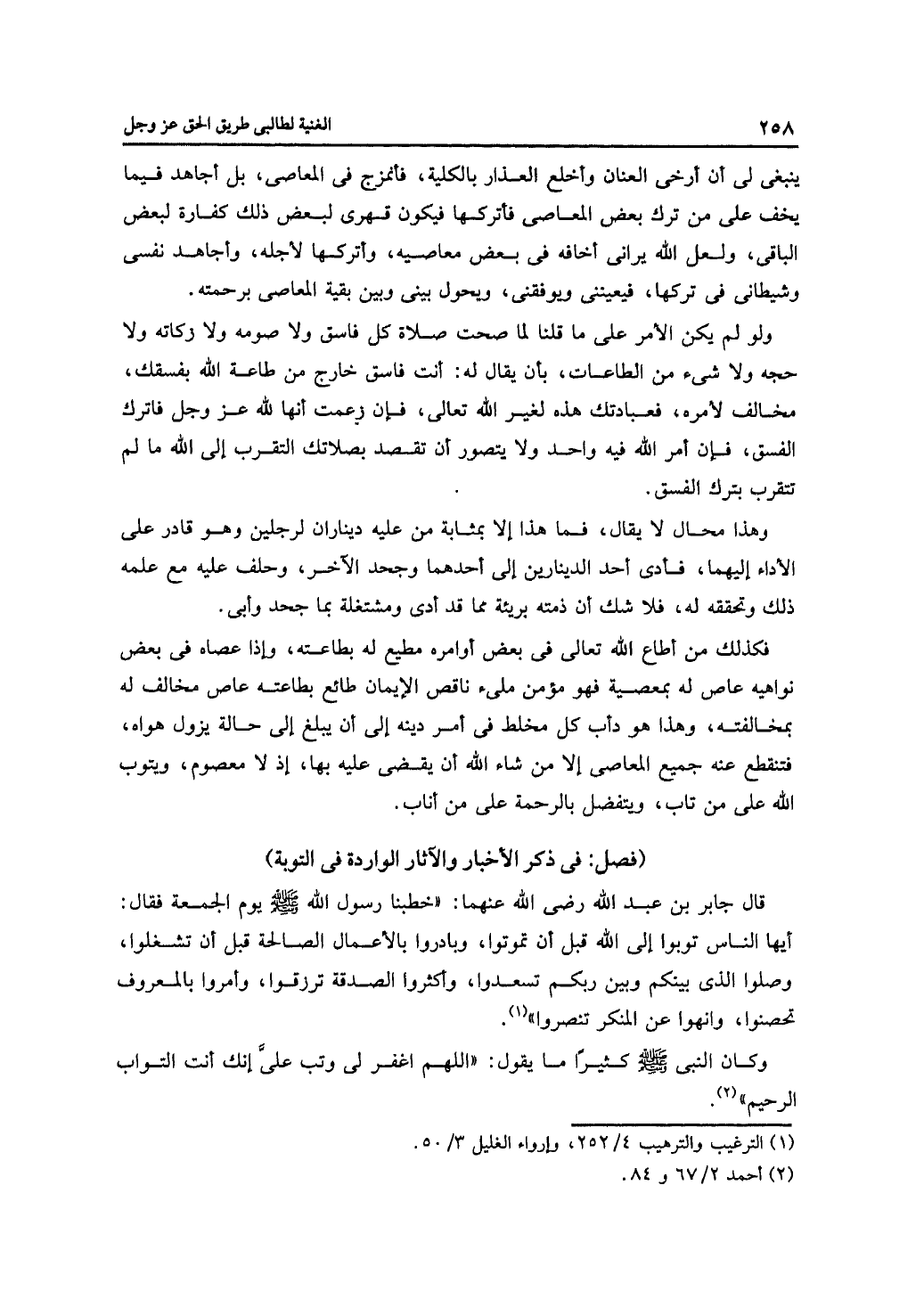 ينبغي لي أن أرخى العنان وخلع العذار بالكلية، فأنمزج في المعاصي، بل أجاهد فيما يخف على من ترك بعض المعاصي فأتركها فيكون قهري لبعض ذلك كفارة لبعض الباقي، ولعل الله يراني أخافه في بعض معاصيه، وأتركها لأجله، وأجاهد نفسي وشيطاني في تركها، فيعينني ويوفقني، ويحول بيني وبين بقية المعاصي برحمته.