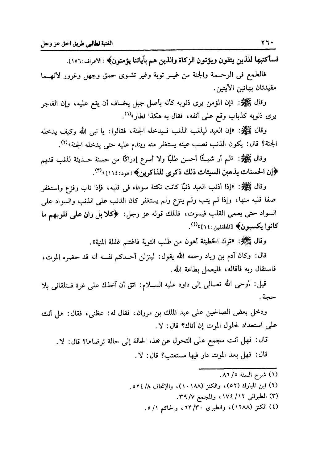 وقال -صلى الله عليه وسلم-: "إذا أذنب العبد ذنبًا كانت نكتة سوداء في قلبه، فإذا تاب وفزع واستغفر صفا قلبه منها، وإذا لم يتب ولم ينزع ولم يستغفر كان الذنب على الذنب والسواد على السواد حتى يعمى القلب فيموت، فذلك قوله عز وجل: {كلا بل ران على قلوبهم كانوا يكسبون} [المطففين: 14] ".