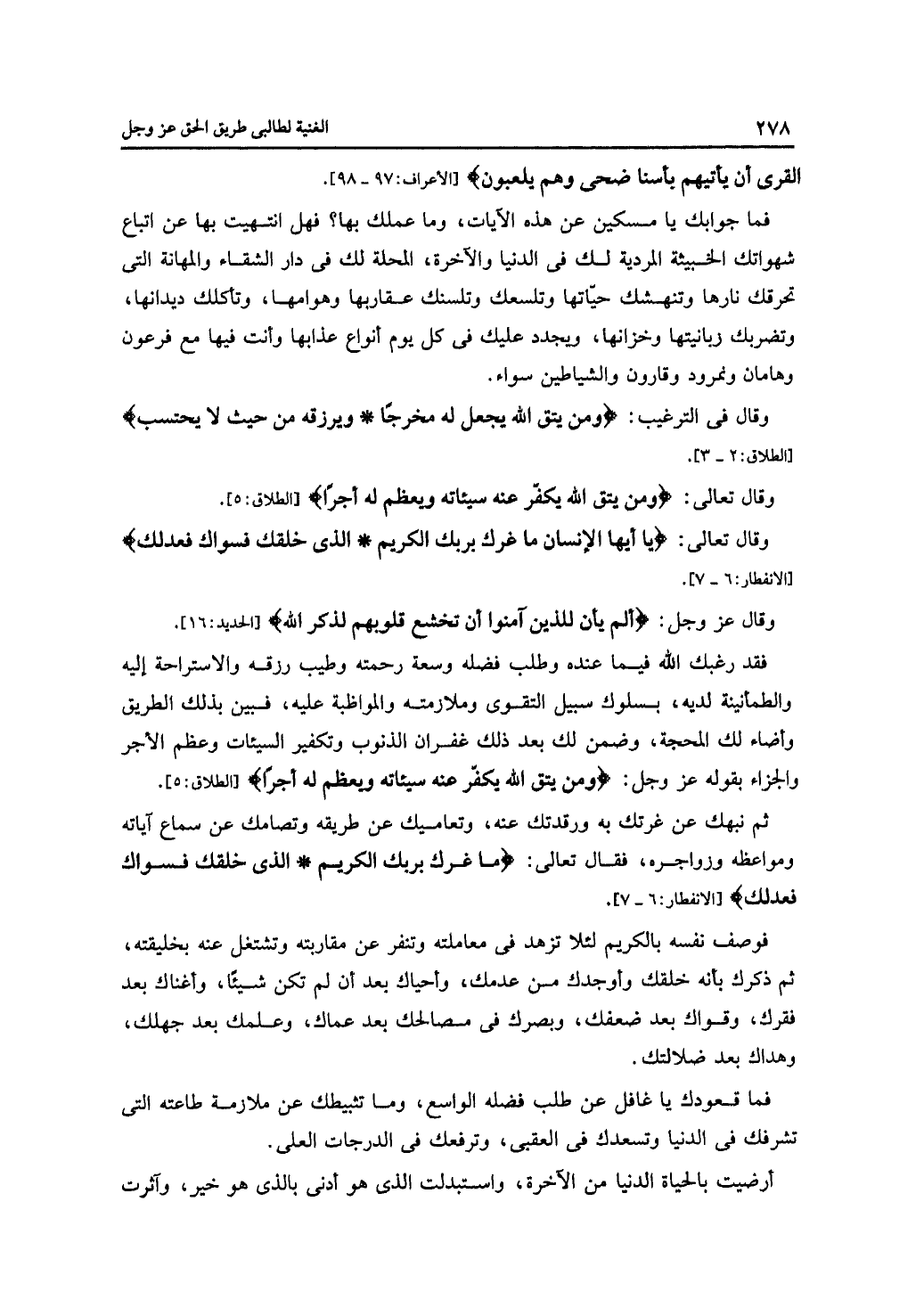 فما جوابك يا مسكين عن هذه الآيات، وما عملك بها؟ فهل انتهيت بها عن إتباع شهواتك الخبيئة المردية لك في الدنيا والآخرة، المحلة لك في دار الشقاء والمهانة التي تحرقك نارها وتنهشك حياتها وتلسعك وتلسنك عقاربها وهوامها، وتأكلك ديدانها، وتضربك زبانيتها وخزانها، ويجدد عليك في كل يوم أنواع عذابها وأنت فيها مع فرعون وهامان ونمرود وقارون والشياطين سواء.