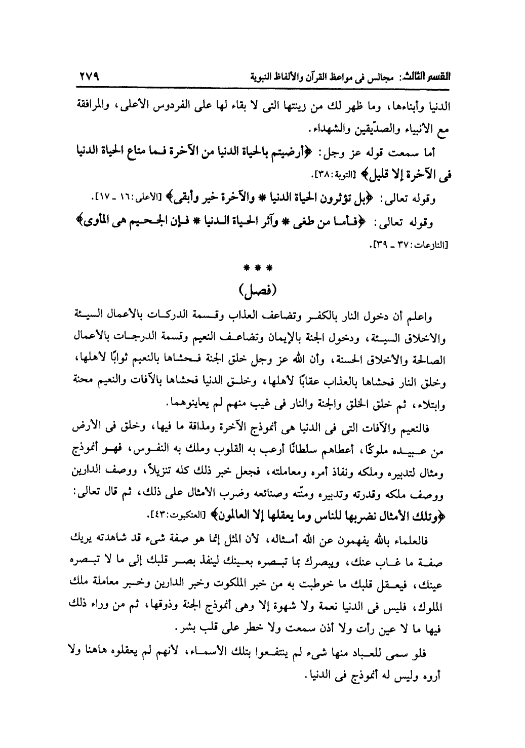 فالعلماء بالله يفهمون عن الله أمثاله، لأن المثل إنما هو صفة شيء قد شاهدته يريك صفة ما غاب عنك، ويبصرك بما تبصره بعينك لينفذ بصر قلبك إلى ما لا تبصره عينك، فيعقل قلبك ما خوطبت به من خبر الملكوت وخبر الدارين وخبر معاملة ملك الملوك، فليس في الدنيا نعمة ولا شهوة إلا وهي أنموذج الجنة وذوقها، ثم من وراء ذلك فيها ما لا عين رأت ولا أذن سمعت ولا خطر على قلب بشر.
