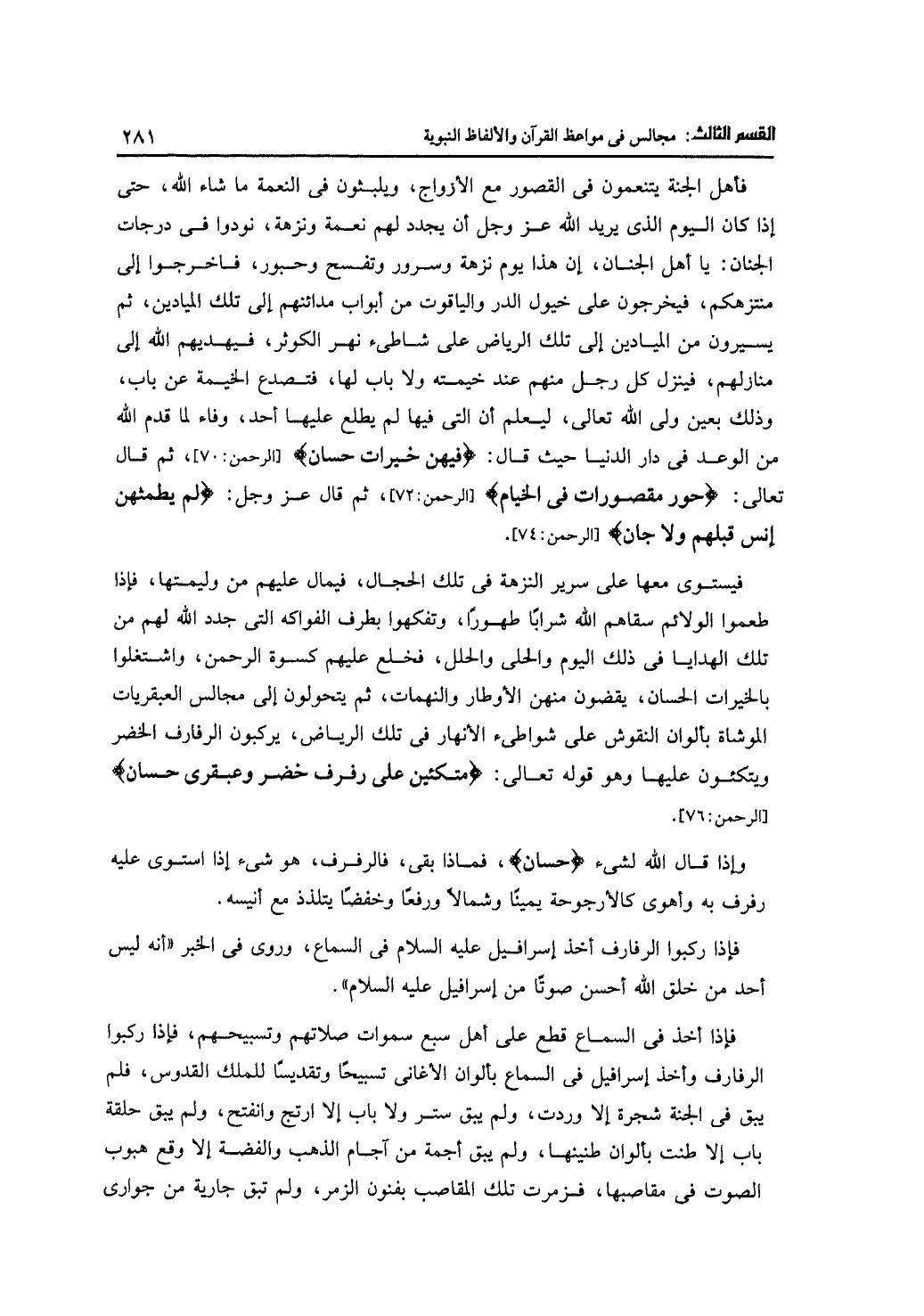 وإذا قال الله لشيء {حسان}، فماذا بقى، فالرفرف، هو شيء إذا استوى عليه رفرف به وأهوى كالأرجوحة يمينًا وشمالًا ورفعًا وخفضًا يتلذذ مع أنيسه.