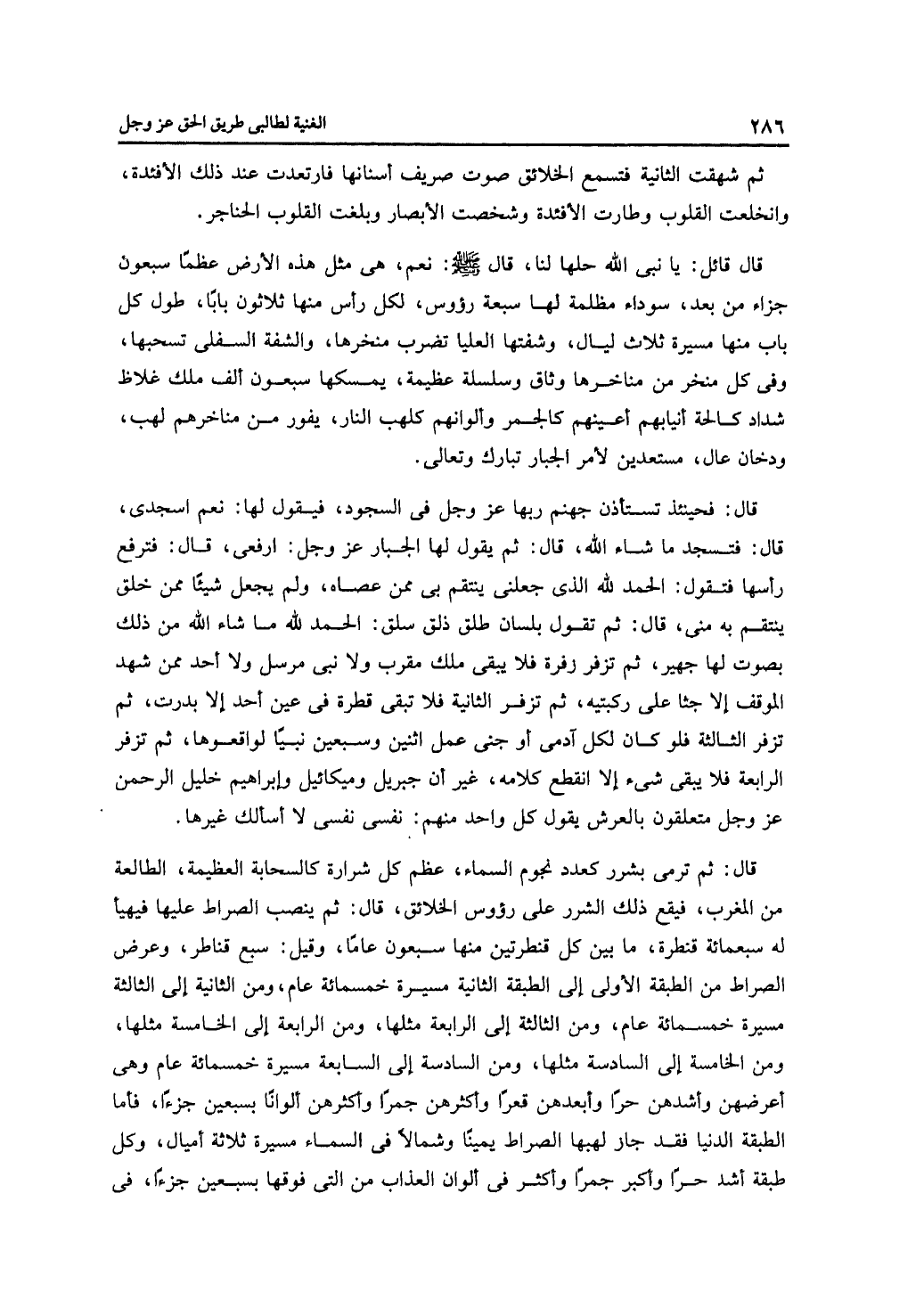 قال" ثم ترمى بشرر كعدد نجوم السماء، عظم كل شرارة كالسحابة العظيمة، الطالعة من المغرب، فيقع ذلك الشرر على رؤوس الخلائق، قال: ثم ينصب الصراط عليها فهيأ له سبعمائة قنطرة، ما بين كل قنطرتين منها سبعون عامًا، وقيل: سبع قناطر، وعرض الصراط من الطبقة الأولى إلى الطبقة الثانية مسيرة خمسمائة عام، ومن الثانية إلى الثالثة مسيرة خمسمائة عام، ومن الثالثة إلى الرابعة مثلها، ومن الرابعة إلى الخامسة مثلها، ومن الخامسة إلى السادسة مثلها، ومن السادسة إلى السابعة مسيرة خمسمائة عام وهي أعرضهن وأشدهن حرًا وأبعدهن قعرًا وأكثرهن جمرًا وأكثرهن ألوانًا بسبعين جزءًا، فأما الطبقة الدنيا فقد جاز لهبها الصراط يمينًا وشمالًا في السماء مسيرة ثلاثة أميال، وكل طبقة أشد حرًا وأكبر جمرًا وأكثر في ألوان العذاب من التي فوقها بسبعين جزءًا، في