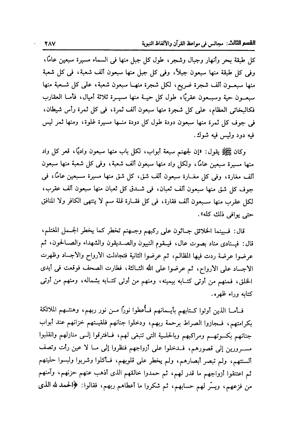 وكان -صلى الله عليه وسلم- يقول: "إن لجهنم سبعة أبواب، لكل باب منها سبعون واديًا، قعر كل واد منها مسيرة سبعين عامًا، ولكل واد منها سبعون ألف شعبة، وفي كل شعبة منها سبعون ألف مغارة، وفي كل مغارة سبعون ألف شق، كل شق منها مسيرة سبعين عامًا، في جوف كل شق منها سبعون ألف ثعبان، في شدق كل ثعبان منها سبعون ألف عقرب، لكل عقرب منها سبعون ألف فقارة، في كل فقارة قلة سم لا ينتهي الكافر ولا المنافق حتى يوافى ذلك كله".
