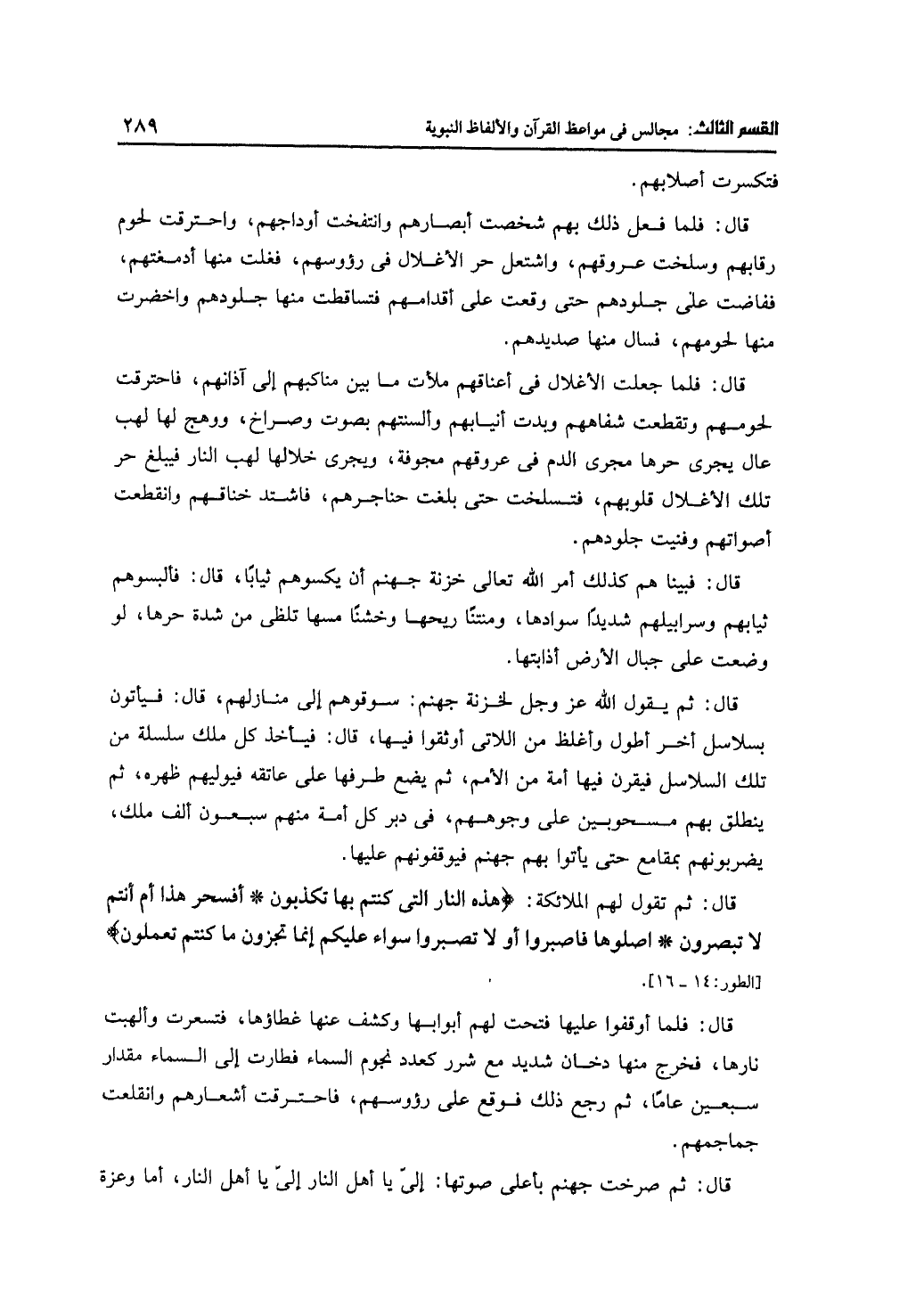 قال: فلما جعلت الأغلال في أعناقهم ملأت ما بين مناكبهم إلى آذانهم، فاحترقت لحومهم وتقطعت شفاههم وبدت أنيابهم وألسنتهم بصوت وصراخ، ووهج لها لهب عال يجرى حرها مجرى الدم في عروقها مجوفة، ويجرى خلالها لهب النار فيبلغ حر تلك الأغلال قلوبهم، فتسلخت حتى بلغت حناجرهم، فاشتد خناقهم وانقطعت أصواتهم وفنيت جلودهم.