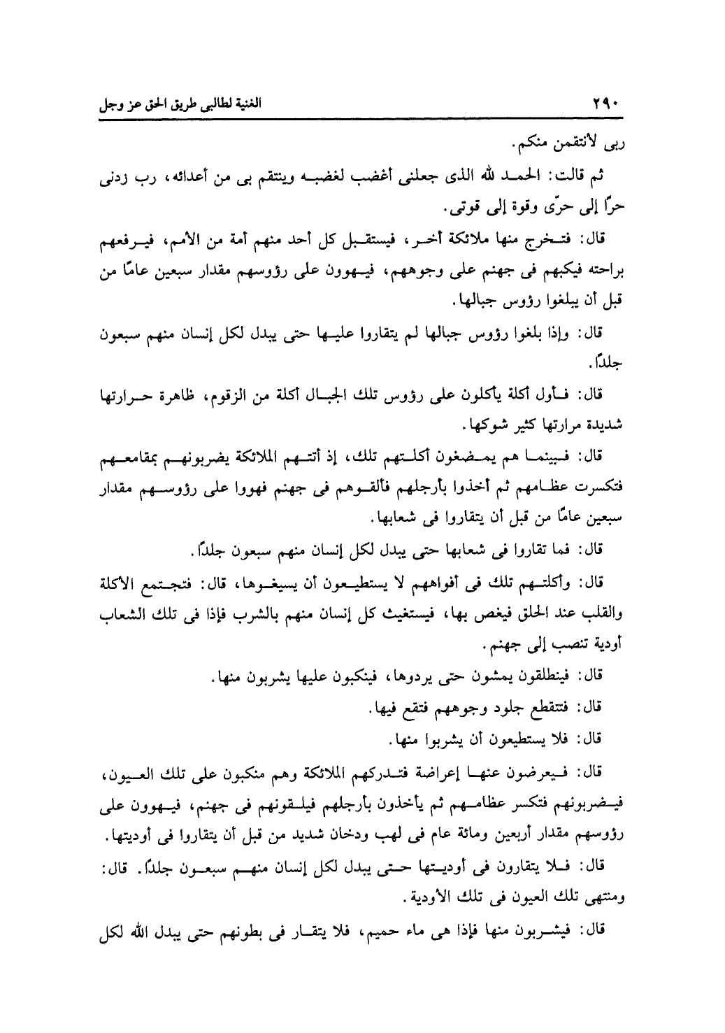 قال: وأكلتهم تلك في أفواههم لا يستطيعون أن يسيغوها، قال: فتجتمع الأكلة والقلب عند الحلق فيغص بها، فيستغيث كل إنسان منهم بالشرب فإذا في تلك الشعاب أودية تنصب إلى جهنم.
