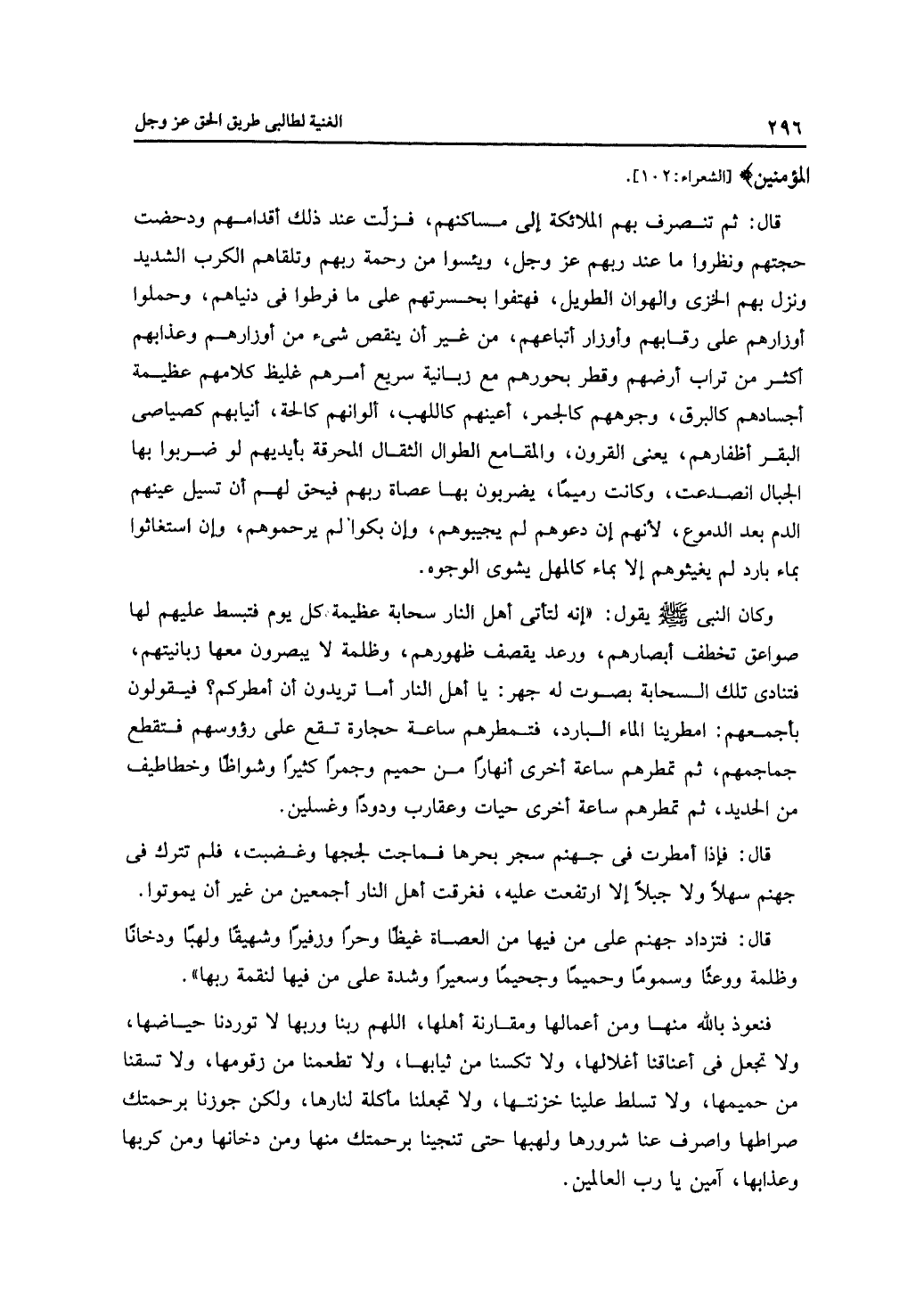 فنعوذ بالله منها ومن أعمالها ومقارنة أهلها، اللهم ربنا وربها لا توردنا حياضها، ولا تجعل في أعناقها أغلالها، ولا تكسنا من ثيابها، ولا تطعمنا من زقومها، ولا تسقنا من حميمها، ولا تسلط علينا خزنتها، ولا تجعلنا مأكلة لنارهم، ولكن جوزنا برحمتك صراطها واصرف عنا شرورها ولهبها حتى تنجينا برحمتك منها ومن دخانها ومن كربها وعذابها، آمين يا رب العالمين.