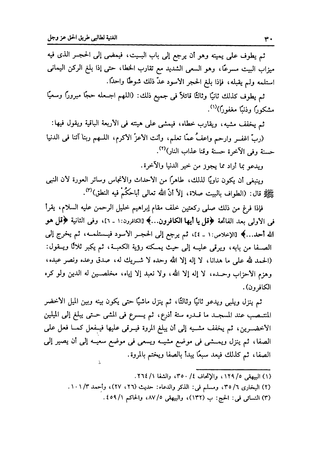 فإذا فرغ من ذلك صلى ركعتين خلف مقام إبراهيم خليل الرحمن عليه السلام، يقرأ في الأولى بعد الفاتحة {قل يا أيها الكافرون ...} [الكافرون: 1 - 6]، وفي الثانية {قل هو الله أحد ...} [الإخلاص: 1 - 4]، ثم يرجع إلى الحجر الأسود فيستمله، ثم يخرج إلى الصفا من بابه، ويرقى عليه إلى حيث يمكنه رؤية الكعبة، ثم يكبر ثلاثًا ويقول: (الحمد لله على ما هدانا، لا إله إلا الله وحده لا شريك له، صدق وعده ونصر عبده، وهزم الأحزاب وحده، لا إله إلا الله، ولا نعبد إلا إياه، مخلصين له الدين ولو كره الكافرون).
