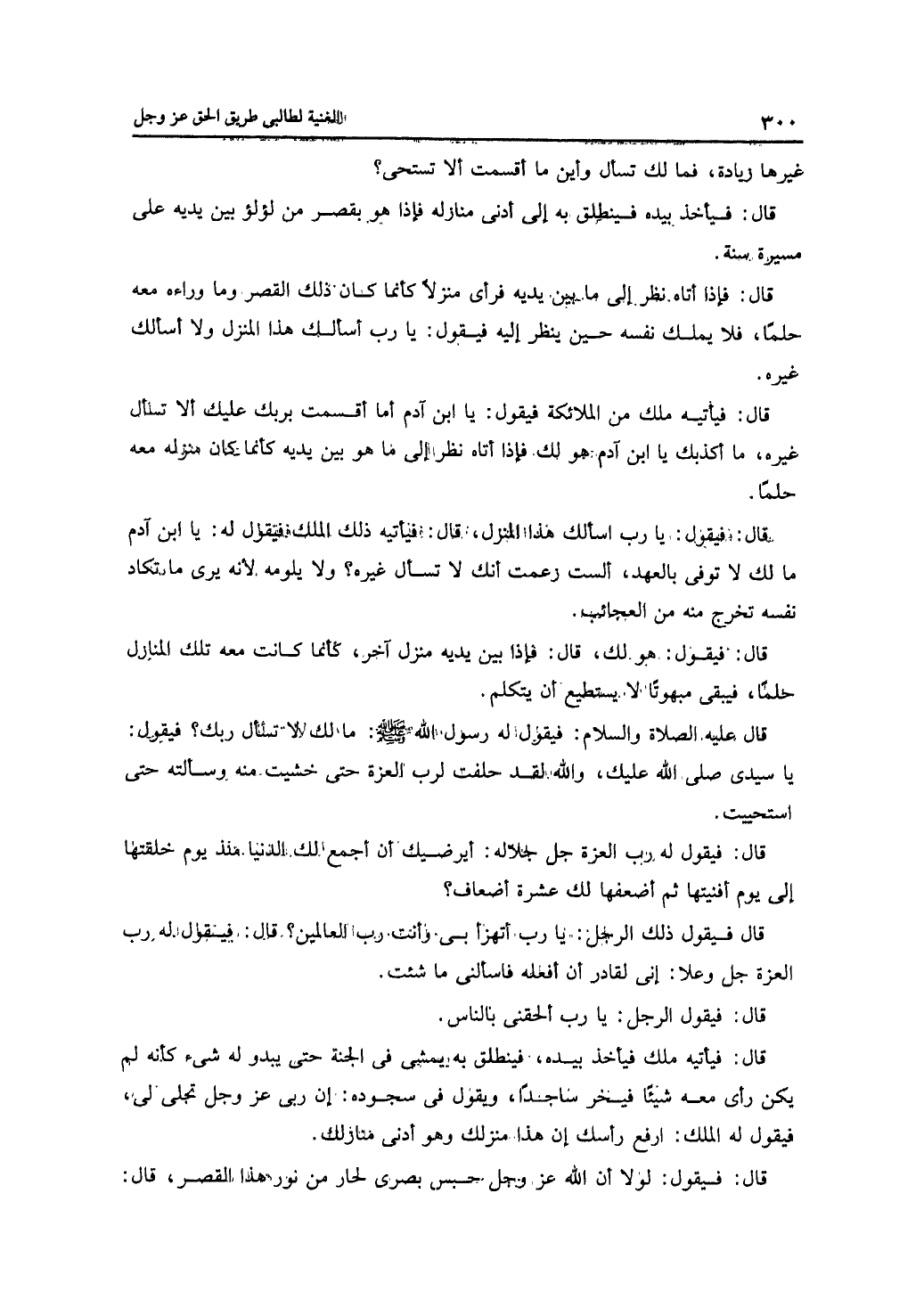 قال: فيقول: يا رب أسألك هذا المنزل، قال: فيأتيه ذلك الملك فيقول له: يا ابن آدم ما لك لا توفى بالعهد، ألست زعمت أنك لا تسأل غيره؟ ولا يلومه لأنه يرى ما تكاد نفسه تخرج منه من العجائب.