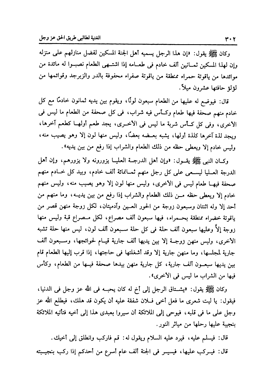 وكان النبي -صلى الله عليه وسلم- يقول: "وإن أهل الدرجة العليا يزورونه ولا يزورهم، وإن أهل الدرجة العليا ليسعى على كل رجل منهم ثمانمائة ألف خادم، وبيد كل خادم منهم صحفة فيها طعام ليس في الأخرى، وليس منها لون إلا وهو يصيب منه، وليس منهم خادم وإلا ويعطي حظه من ذلك الطعام والشراب إذا رفع من بين يديه، وما منهم من أحد إلا وله اثنتان وسبعون زوجة من الحور العين وآدميتان، لكل زوجة منهن قصر من ياقوتة خضراء ممنطقة بحمراء، فيها سبعون ألف مصراع، لكل مصراع قبة وليس منها زوجة إلا وعليها سبعون ألف حلة في كل حلة سبعون ألف لون، ليس منها حلة تشبه الأخرى، وليس منهن زوجة إلا بين يديها ألف جارية قيام لحوائجها، وسبعون ألف جارية لمجلسها، وما منهن جارية إلا وقد أشغلتها في حاجتها، إذا قرب إليها الطعام قام بين يديها سبعون ألف جارية، كل جارية منهم بيدها صحفة فيها من الطعام، وكأس فيها من الشراب ما ليس في الأخرى".