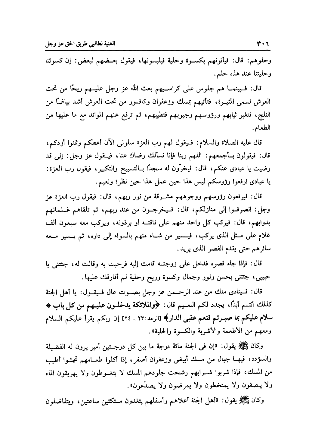 قال: فينادي ملك من عند الرحمن عز وجل بصوت عال فيقول: يا أهل الجنة كذلك أنتم أبدًا، يجدد لكم النعيم قال: {والملائكة يدخلون عليهم من كل باب * سلام عليكم بما صبرتم فنعم عقبي الدار} [الرعد: 23 - 24] إن ربكم يقرأ عليكم السلام ومعهم من الأطعمة والأشربة والكسوة والحلية".