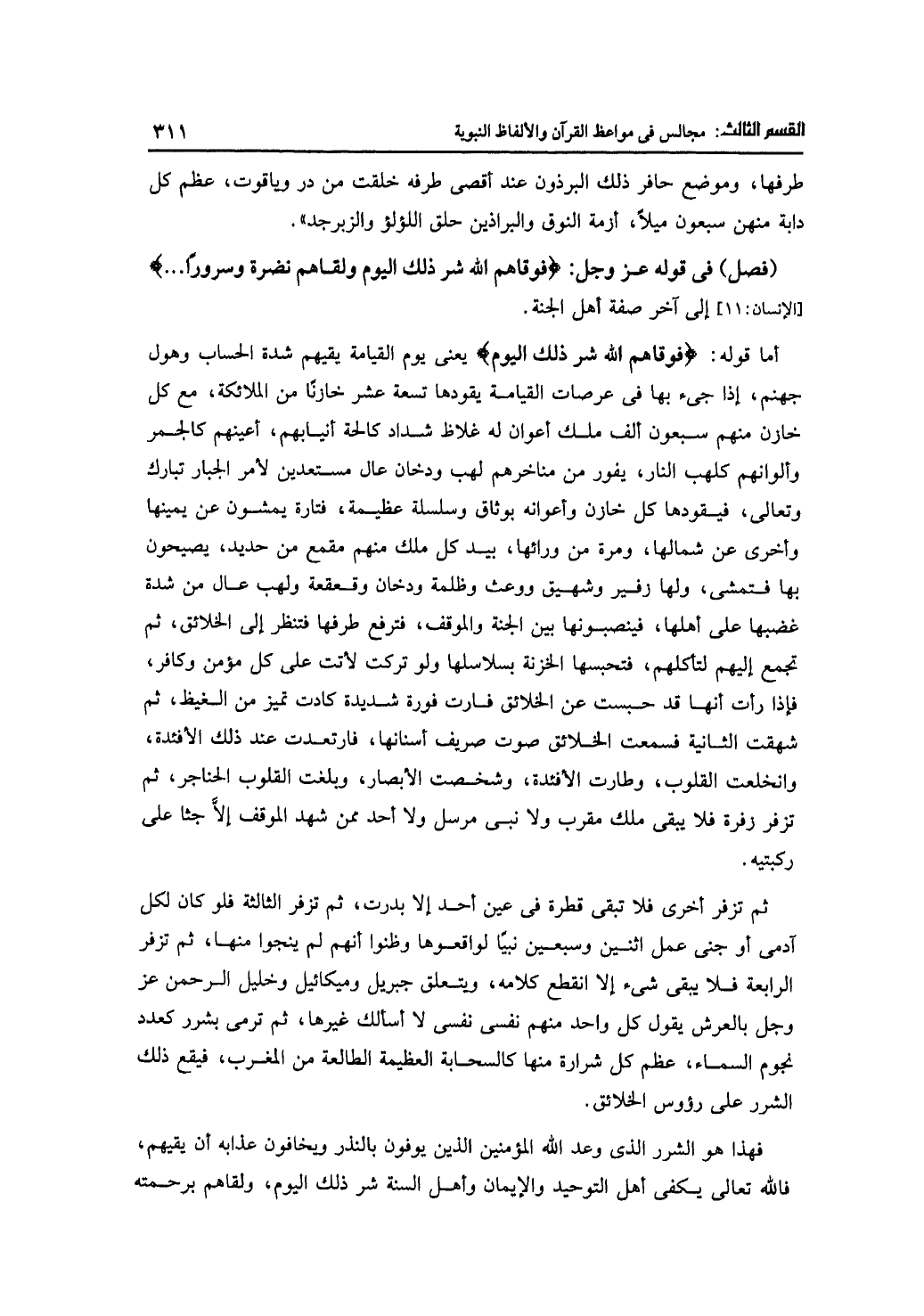 أما قوله: {فوقاه الله شر ذلك اليوم} يعني يوم القيامة يقيهم شدة الحساب وهول جهنم، إذا جئ بها في عرصات القيامة يقودها تسعة عشر خازنًا من الملائكة، مع كل خازن منهم سبعون ألف ملك أعوان له غلاظ شداد كالحة أنيابهم، أعينهم كالجمر وألوانهم كلهب النار، يفور من مناخرهم لهب ودخان عال مستعدين لأمر الجبار تبارك وتعالى، فيقودها كل خازن وأعوانه بوثاق وسلسلة عظيمة، فتارة يمشون عن يمينها وأخرى عن شمالها، ومرة من ورائها، بيد كل ملك منهم مقمع من جديد، يصيحون بها فتمشى، ولها زفير وشهيق ووعث وظلمة ودخان وقعقعة ولهب عال من شدة غضبها على أهلها، فينصبونها بين الجنة والموقف، فترفع طرفها فتنظر إلى الخلائق، ثم تجمع إليهم لتأكلهم، فتحبسها الخزنة بسلاسلها ولو تركت لأتت على كل مؤمن وكافر، فإذا رأت أنها قد حبست عن الخلائق فارت فورة شديدة كادت تميز من الغيظ، ثم شهقت الثانية فسمعت الخلائق صوت صريف أسنانها، فارتعدت عند ذلك الأفئدة، وانخلعت القلوب، وطارت الأفئدة، وشخصت الأبصار، وبلغت القلوب الحناجر، ثم تزفر زفرة فلا يبقى ملك مقرب ولا نبي مرسل ولا أحد ممن شهد الموقف إلا جثا على ركبتيه.