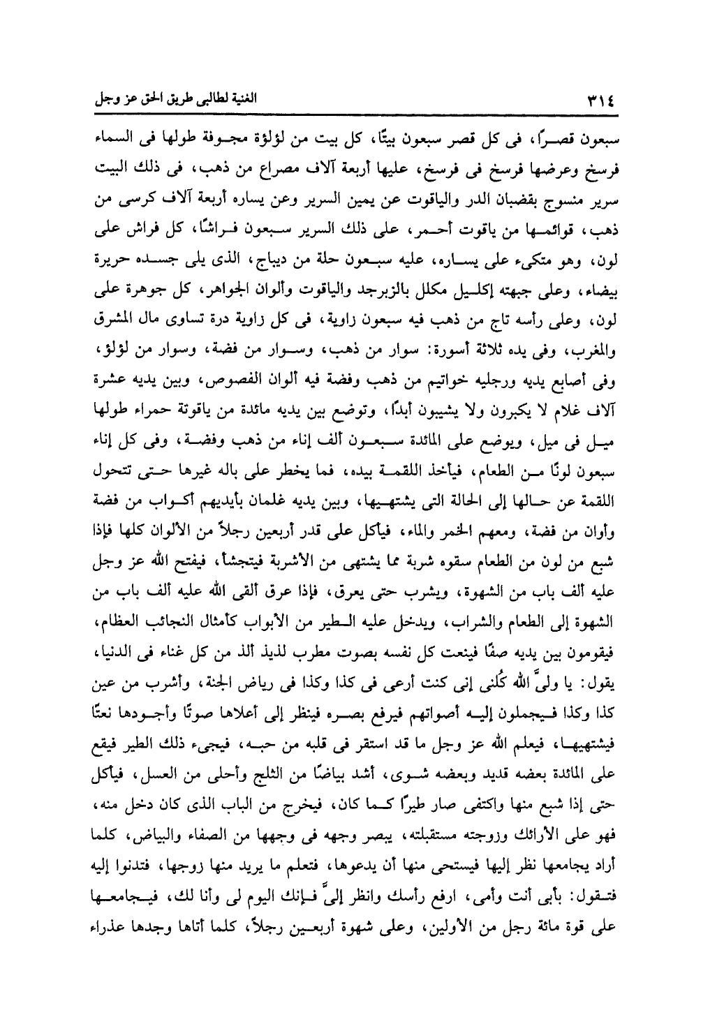 سبعون قصرًا، في كل قصر سبعون بيتًا، كل بيت من لؤلؤة مجوفة طولها في السماء فرسخ وعرضها فرسخ في فرسخ، عليها أربعة آلاف مصراع من ذهب، في ذلك البيت سرير منسوج بقضبان الدر والياقوت عن يمين السرير وعن يساره أربعة آلاف كرسي من ذهب، قوائمها من ياقوت أحمر، على ذلك السرير سبعون فراشًا، كل فراش على لون، وهو متكئ على يساره، عليه سبعون حلة من ديباج، الذي يلي جسده حريرة بيضاء، وعلى جبهته إكليل مكلل بالزبرجد والياقوت وألوان الجواهر، كل جوهرة على لون، وعلى رأسه تاج من ذهب فيه سبعون زاوية، في كل زاوية درة تساوي مال المشرق والمغرب، وفي يده ثلاثة أسورة: سوار من ذهب، وسوار من فضة، وسوار من لؤلؤ، وفي أصابع يديه ورجليه خواتيم من ذهب وفضة فيه ألوان الفصوص، وبين يديه عشرة آلاف غلام لا يكبرون ولا يشيبون أبدًا، وتوضع بين يديه مائدة من ياقوتة حمراء طولها ميل في ميل، ويوضع على المائدة سبعون ألف إناء من ذهب وفضة، وفي كل إناء سبعون لونًا من الطعام، فيأخذ اللقمة بيده، فما يخطر على باله غيرها حتى تتحول اللقمة عن حالها إلى الحالة التي يشتهيها، وبين يديه غلمان بأيديهم أكواب من فضة وأوان من فضة، ومعهم الخمر والماء، فيأكل على قدر أربعين رجلًا من الألوان كلها فإذا شبع من لون من الطعام سقوه شربة مما يشتهي من الأشربة فيتجشأ، فيفتح الله عز وجل عليه ألف باب من الشهوة، ويشرب حتى يعرق، فإذا عرق ألقى الله عليه ألف باب من الشهوة إلى الطعام والشراب، ويدخل عليه الطير من الأبواب كأمثال النجائب العظام، فيقومون بين يديه صفًا فينعت كل نفسه بصوت مطرب لذيذ ألذ من كل غناء في الدنيا، يقول: يا ولي الله كلني إني كنت أرعى في كذا وكذا في رياض الجنة، وأشرب من عين كذا وكذا فيجملون إليه أصواتهم فيرفع بصره فينظر إلى أعلاه صوتًا وأجودها نعتًا فيشتهيها، فيعلم الله عز وجل ما قد استقر في قلبه من حبه، فيجئ ذلك الطير فيقع على المائدة بعضه قديد وبعضه شوى، أشد بياضًا من الثلج وأحلى من العسل، فيأكل حتى إذا شبع منها واكتفى صار طيرًا كما كان، فيخرج من الباب الذي كان دخل منه، فهو على الأرائك وزوجته مستقبلته، يبصر وجهه في وجهها من الصفا والبياض، كلما أراد يجامعها نظر إليها فيستحى منها أن يدعوها، فتعلم ما يريد منها زوجها، فتدنوا إليه فتقول: بأبي أنت وأمي، أرفع رأسك وانظر إلي فإنك اليوم لي وأنا لك، فيجامعها على قوة مائة رجل من الأولين، وعلى شهوة أربعين رجلًا، كلما أتاها وجدها عذراء
