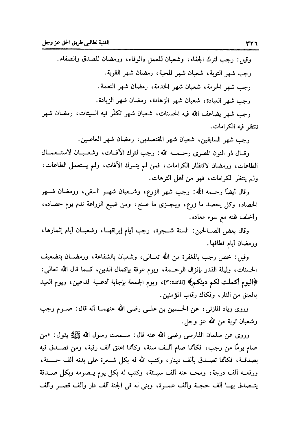 وقيل: خص رجب بالمغفرة من الله تعالى، وشعبان بالشفاعة، ورمضان بتضعيف الحسنات، وليلة القدر بإنزال الرحمة، ويوم عرفة بإكمال الدين، كما قال الله تعالى: {اليوم أكملت لكم دينكم]، ويوم الجمعة بإجابة أدعية الداعين، ويوم العيد بالعتق من النار، وفكاك رقاب المؤمنين.