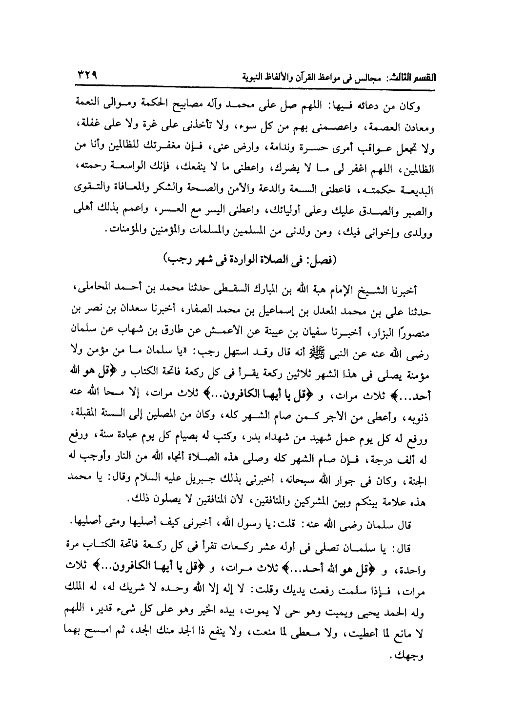 أخبرنا الشيخ الإمام هبة الله بن المبارك السقطي حدثنا محمد بن أحمد المحاملي، حدثنا علي بن محمد المعدل بن إسماعيل بن محمد الصفار، أخبرنا سعدان بن نصر بن منصورًا البزار، أخبرنا سفيان بن عيينة عن الأعمش عن طارق بن شهاب عن سلمان -رضي الله عنه- عن النبي -صلى الله عليه وسلم- أنه قال وقد استهل رجب: "يا سلمان ما من مؤمن ولا مؤمنة يصلي في هذا الشهر ثلاثين ركعة يقرأ في كل ركعة فاتحة الكتاب و {قل هو الله أحد} ثلاث مرات، و {قل يا أيها الكافرون ...} ثلاث مرات، إلا محا الله عنه ذنوبه، وأعطى من الأجر كمن صام الشهر كله، وكان من المصلين إلى السنة المقبلةـ ورفع له كل يوم عمل شهيد من شهداء بدر، وكتب له بصيام كل يوم عبادة سنة، ورفع له ألف درجة، فإن صام الشهر كله وصلى هذه الصلاة أنجاه الله من النار وأوجب له الجنة، وكان في جوار الله سبحانه، أخبرني بذلك جبريل -عليه السلام- وقال: يا محمد هذه علامة بينكم وبين المشركين والمنافقين، لأن المنافقين لا يصلون ذلك.