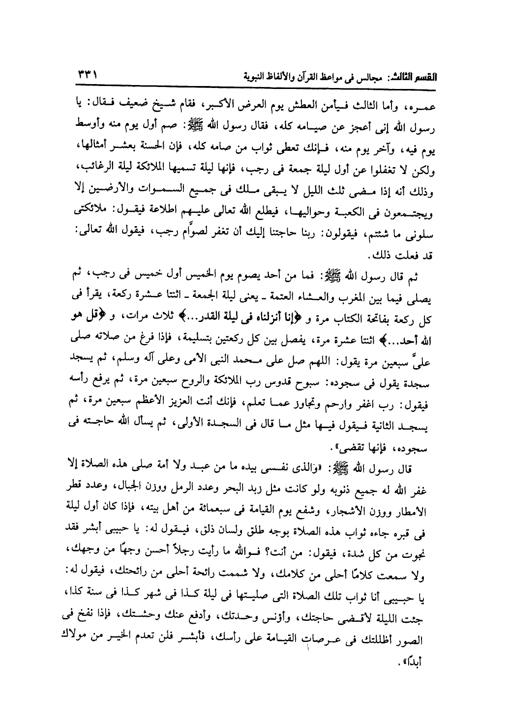 عمره، وأما الثالث فيأمن العطش يوم العرض الأكبر، فقام شيخ ضعيف فقال: يا رسول الله إني أعجز عن صيامه كله، فقال رسول الله -صلى الله عليه وسلم-: صم أول يوم منه وأوسط يوم فيه، وآخر يوم منه، فإنك تعكي ثواب من صامه كله، فإن الحسنة بعشر أمثالها، ولكن لا تغفلوا عن أول ليلى جمعة في رجب، فإنها ليلة تسميها الملائكة ليلة الرغائب، وذلك أنه إذا مضى ثلث الليل لا يبقى ملك في جميع السموات والأرضين إلا ويجتمعون في الكعبة وحواليها، فيطلع الله تعالى عليهم اطلاعة فيقول: ملائكتي سلوني ما شئتم، فيقولون: ربنا حاجتنا إليك أن تغفر لصوام رجب، فيقول الله تعالى: قد فعلت ذلك.
