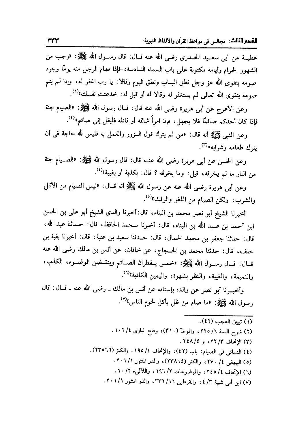 وأخبرنا أبو نصر عن والده بإسناده عن أنس بن مالك -رضي الله عنه- قال: قال رسول الله -صلى الله عليه وسلم-: "من صام من ظل يأكل لحوم الناس".