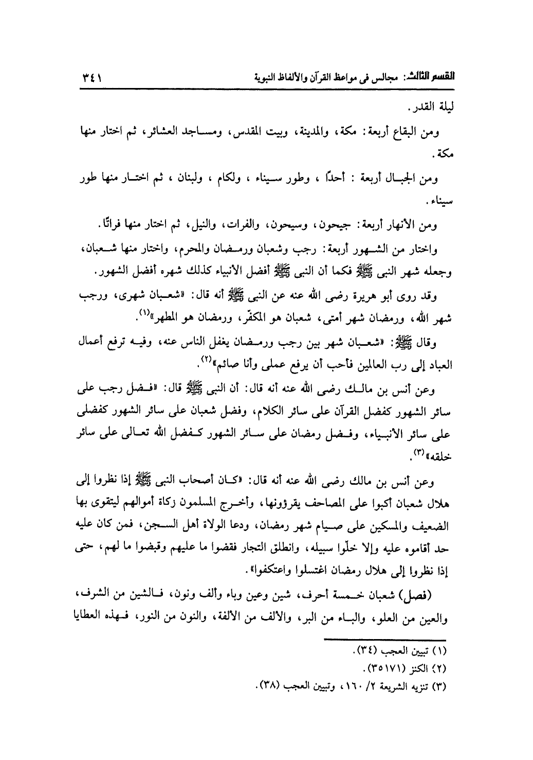 (فصل) شعبان خمسة أحرف، شين وعين وباء وألف ونون، فالشين من الشرف، والعين من العلو، والباء من البر، والألف من الألفة، والنون من النور، فهذه العطايا