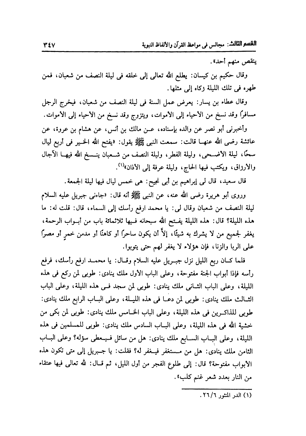 وقال عطاء بن يسار: يعرض عمل السنة في ليلة النصف من شعبان، فيخرج الرجل مسافرًا وقد نسخ من الأحياء إلى الأموات، ويتزوج وقد نسخ من الأحياء إلى الأموات.