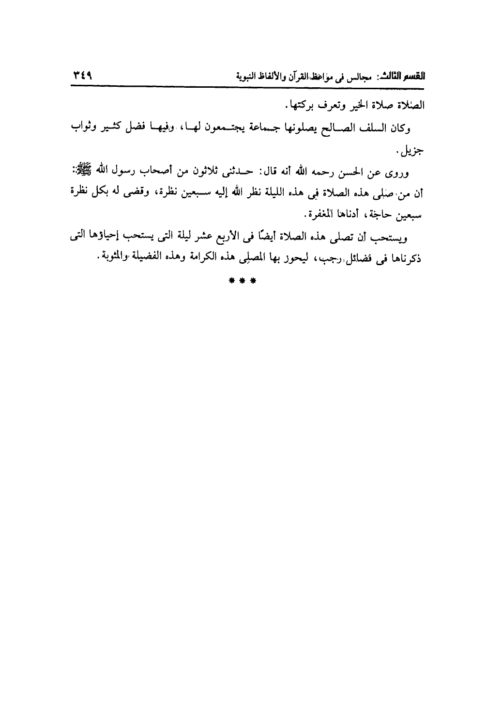 وروى عن الحسن رحمه الله أنه قال: حدثني ثلاثون من أصحاب رسول الله -صلى الله عليه وسلم- أن من صلى هذه الصلاة في هذه الليلة نظر الله إليه سبعين نظرة، وقضى له بكل نظرة سبعين حاجة، أدناها المغفرة.