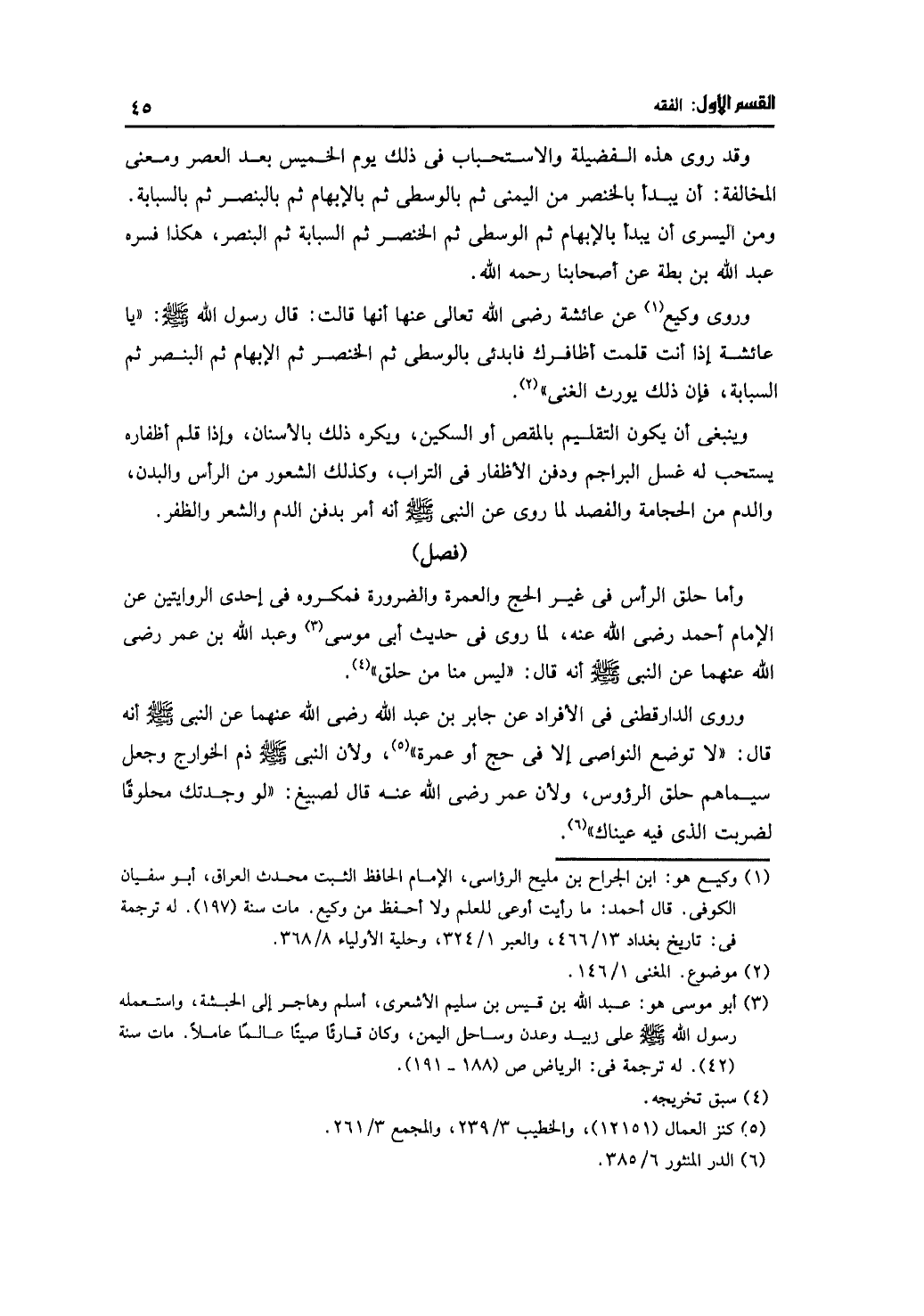 وروى وكيع عن عائشة رضي الله تعالى عنها أنها قالت: قال رسول الله -صلى الله عليه وسلم-: «يا عائشة إذا أنت قلمت أظافرك فابدئي بالوسطى ثم الخنصر ثم الإبهام ثم البنصر ثم السبابة، فإن ذلك يورث الغنى».
