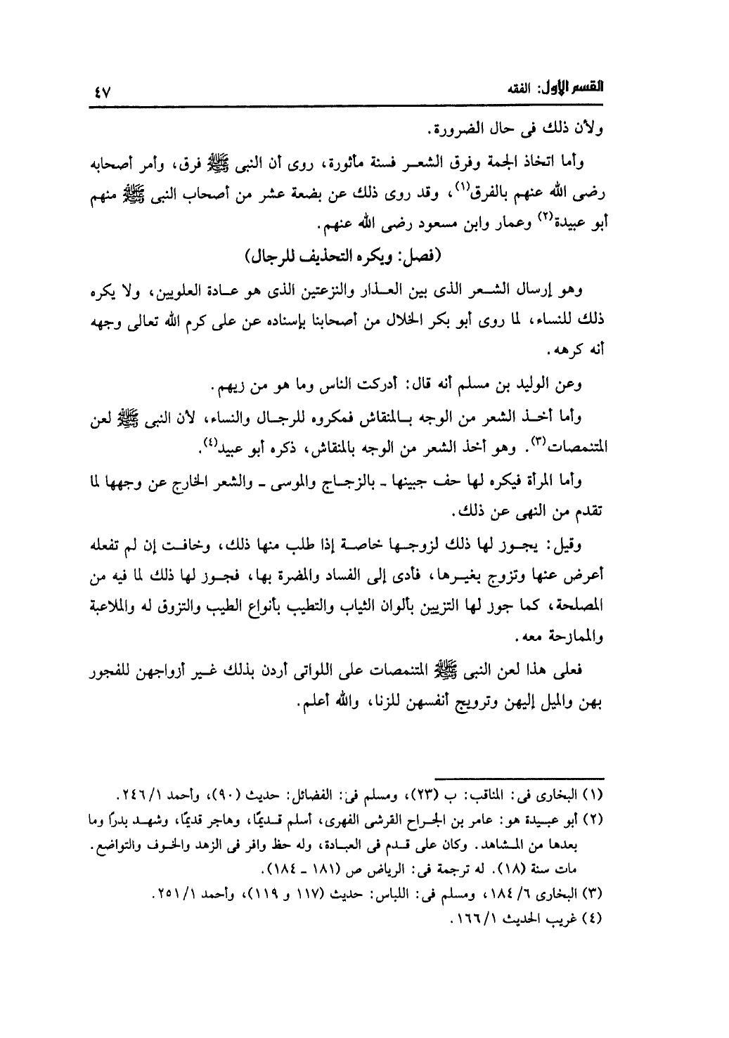 وأما أخذ الشعر من الوجه بالمنقاش فمكروه للرجال والنساء، لأن النبي -صلى الله عليه وسلم- لعن المتنمصات. وهو أخذ الشعر من الوجه بالمنقاش، ذكره أبو عبيد.