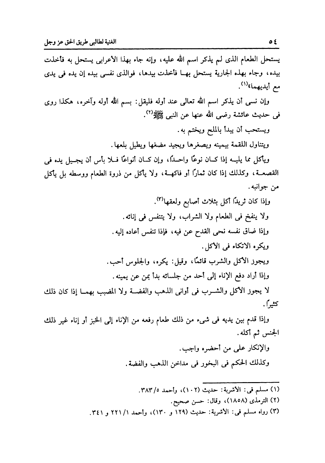 ويتناول اللقمة بيمينه ويصغرها ويجيد مضغها ويطيل بلعها.