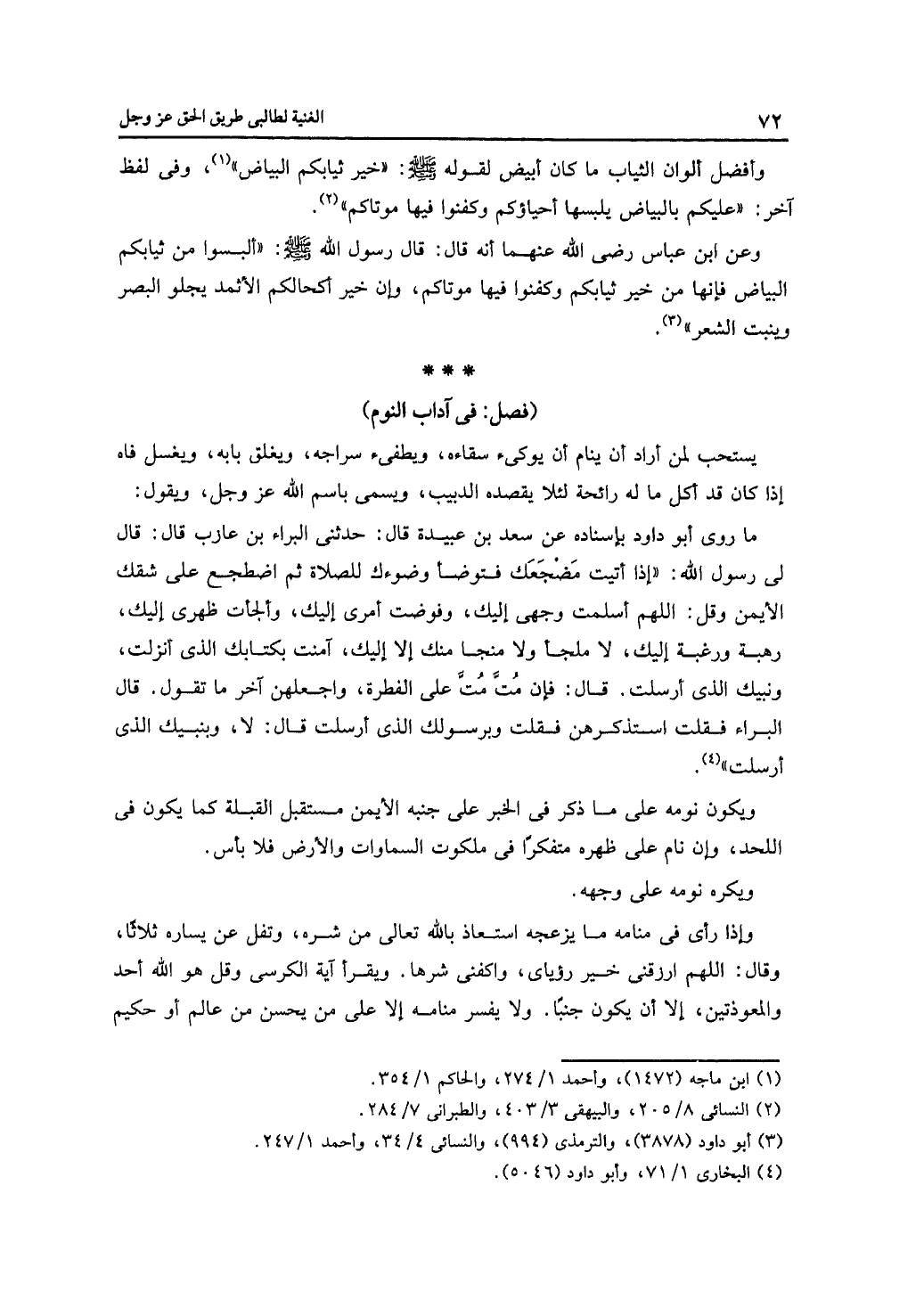 ما روى أبو داود بإسناده عن سعد بن عبيدة قال: حدثين البراء عن عازب قال: قال لي رسول الله: ((إذا أتيت مضجعك فتوضأ وضوءك للصلاة ثم اضطجع على شقك الأيمن وقل: اللهم أسلمت وجهي إليك، وفوضت أمري إليك، وألجأت ظهري إليك، رهبة ورغبة إليك، لا ملجأ ولا منجا منك إلا إليك، آمنت بكتابك الذي أنزلت، ونبيك الذي أرسلت. قال: فإن مت مت على الفطرة، واجعلهن آخر ما تقول. قال البراء فقلت استذكرهن فقلت وبرسلوك الذي أرسلت قال: لا، وبنبيك الذي أرسلت)).