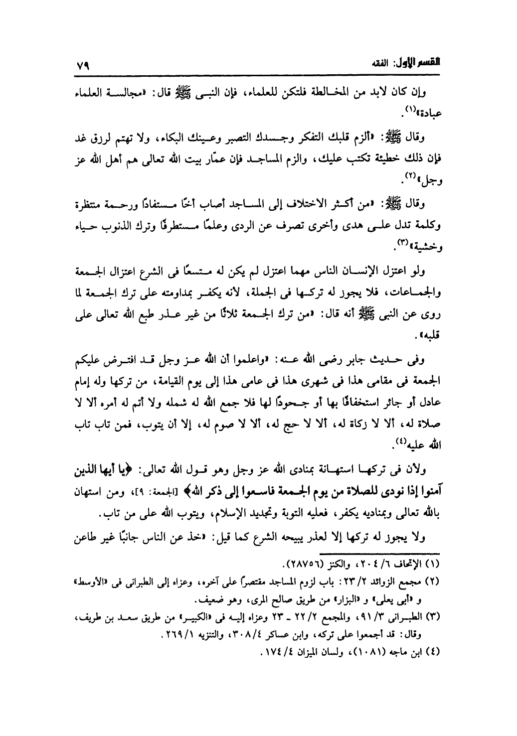 ولو اعتزل الإنسان الناس مهما اعتزل لم يكن له متسعًا في الشرع اعتزال الجمعة والجماعات، فلا يجوز له تركها في الجملة، لأنه يكفر بمداومته على ترك الجمعة لما روى عن النبي- صلى الله عليه وسلم- أنه قال: ((من ترك الجمعة ثلاثًا من غير عذر طبع الله تعالى على قلبه)).