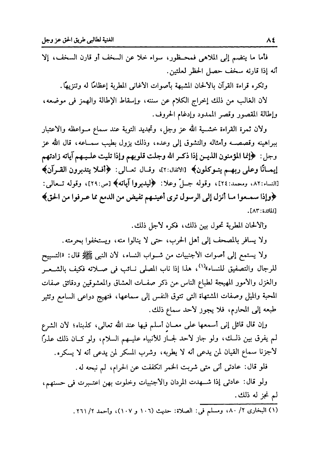 ولا يستمع إلى أصوات الأجنبيات من شواب النساء، لأن النبي - صلى الله عليه وسلم- قال: ((التسبيح للرجال والتصفيق للنساء))، هذا إذا ناب المصلى نائب في صلاته فكيف بالشعر والغناء والغزل والأمور المهيجة لطباع الناس من ذكر صفات العشاق والمعشوقين ودقائق صفات المحبة والميل وصفات المشتهاة التي تتوق النفس إلى سماعها، فتهيج دواعي السامع وتثير طبعه إلى المحارم، فلا يجوز لأحد سماع ذلك.