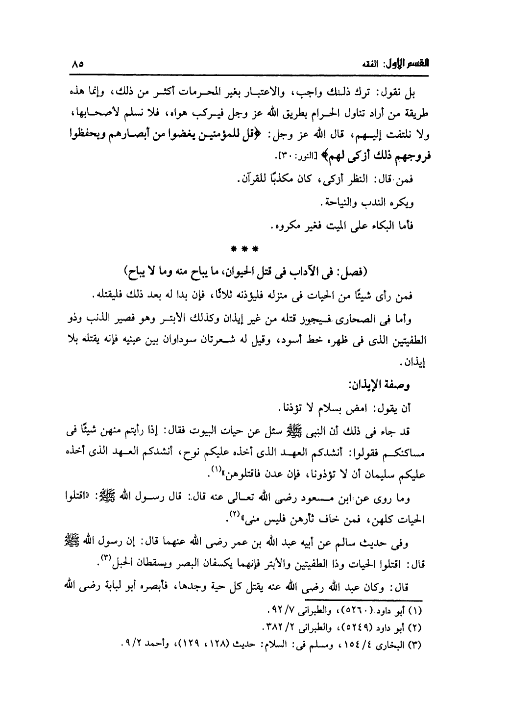 وأما في الصحارى فيجوز قتله من غير إيذان وكذلك الأبتر وهو قصير الذنب وذو الطفيتين الذي في ظهره خط أسود، وقيل له شعرتان سوداوان بين عينيه فإنه يقتله بلا إيذان.