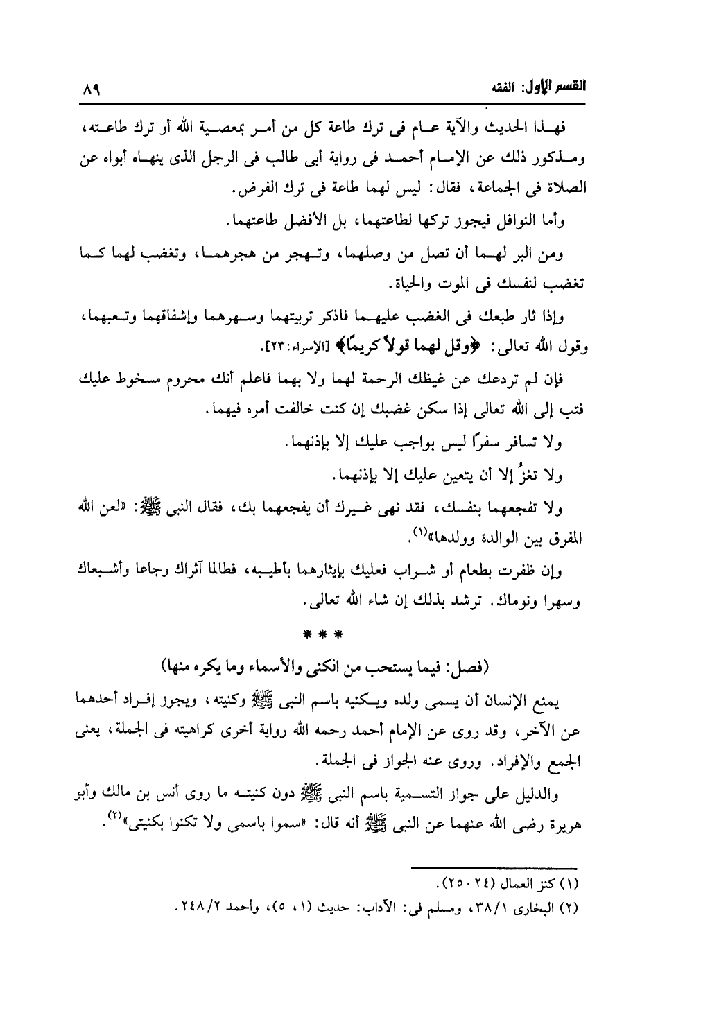 يمنع الإنسان أن يسمي ولده ويكنيه باسم النبي- صلى الله عليه وسلم- وكنيته، ويجوز إفراد أحدهما عن الآخر، وقد روى عن الإمام أحمد رحمه الله رواية أخرى كراهيته في الجملة، يعني الجمع والإفراد. وروى عنه الجواز في الجملة.