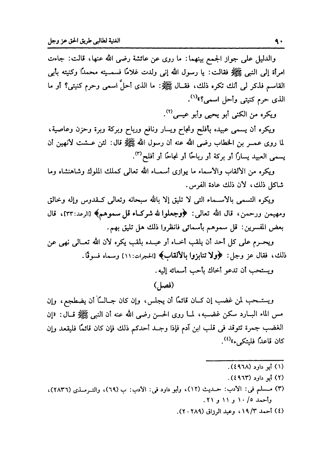والدليل على جواز الجمع بينهما: ما روى عن عائشة رضي الله عنها، قالت: جاءت امرأة إلى النبي- صلى الله عليه وسلم- فقالت: يا رسول الله إني ولدت غلامًا فسميته محمدًا وكنيته بأبي القاسم فذكر لي أنك تكره ذلك، فقال- صلى الله عليه وسلم-: ما الذي أحل اسمي وحرم كنيتي؟ أو ما الذي حرم كنيتي وأحل اسمي؟)).