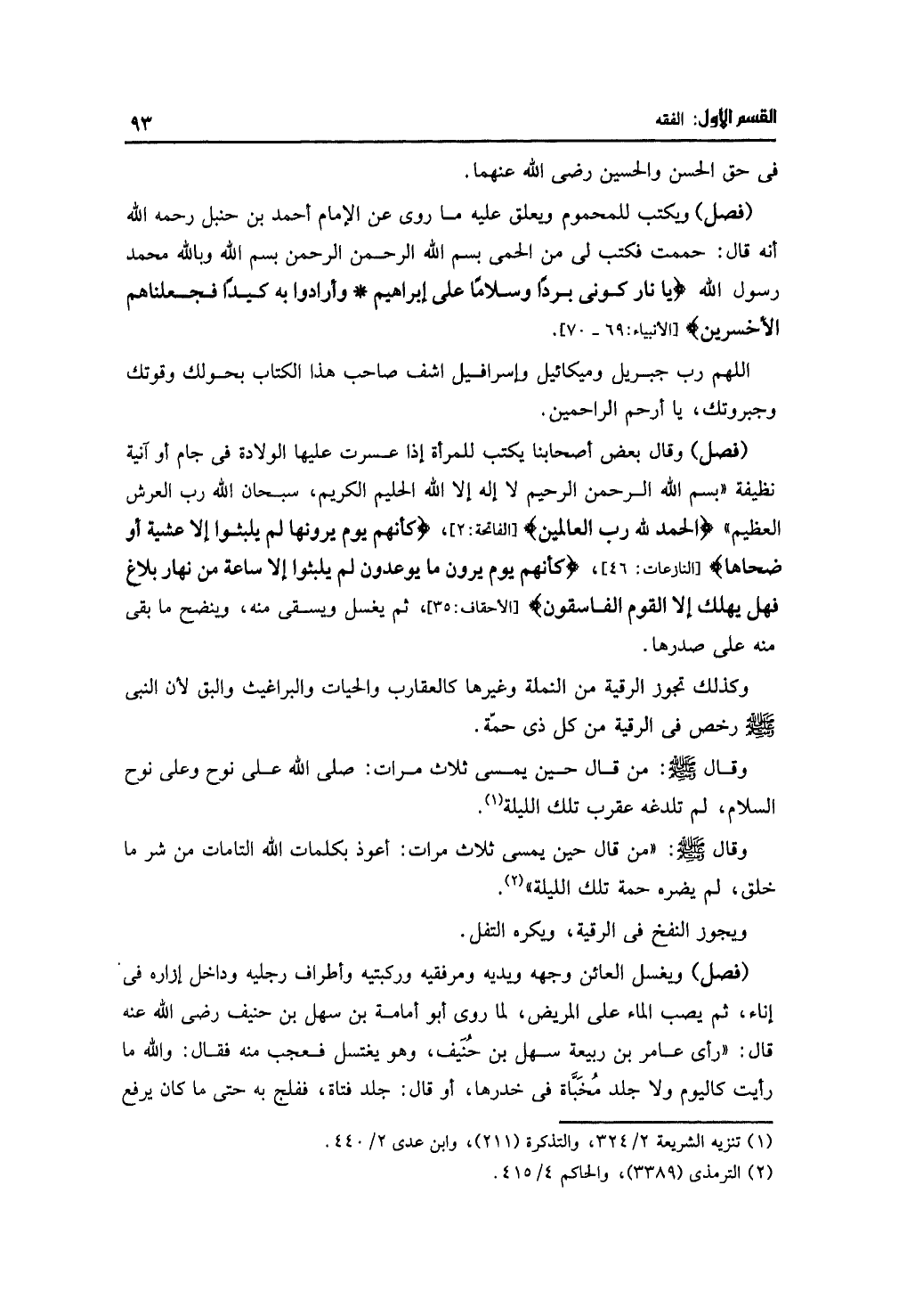 (فصل) ويكتب للمحموم ويعلق عليه ما روى عن الإمام أحمد بن حنبل رحمه الله أنه قال: حممت فكتب لي من الحمى بسم الله الرحمن الرحيم بسم الله وبالله محمد رسول الله: {يا نار كوني بردًا وسلامًا على إبراهيم * وأرادوا به كيدًا فجعلناهم الأخسرين} [الأنبياء: 69 - 70].