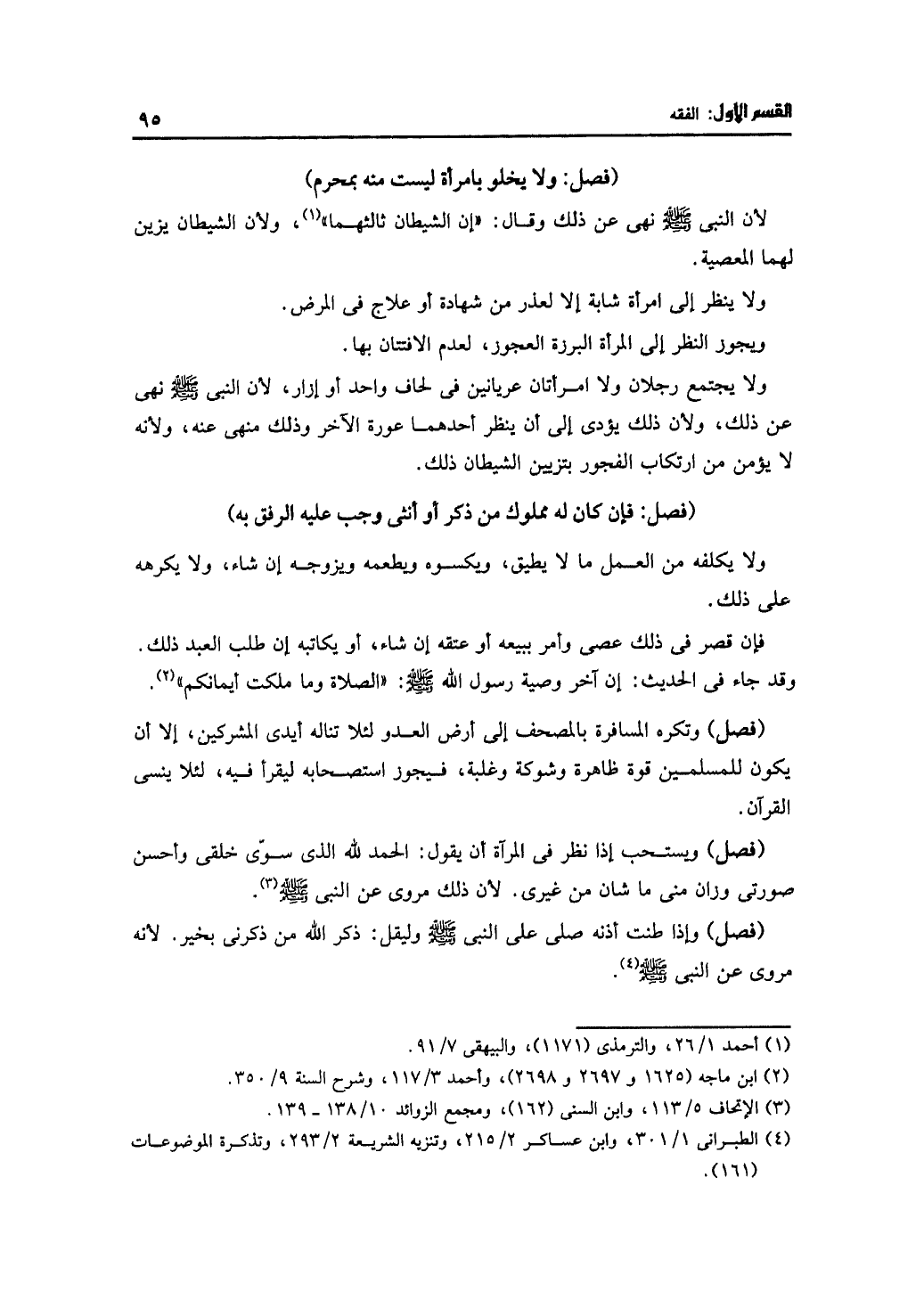 (فصل) ويستحب إذا نظر في المرآة أن يقول: الحمد لله الذي سوى خلقي وأحسن صورتي وزان مني ما شان من غيري. لأن ذلك مروي عن النبي- صلى الله عليه وسلم-.