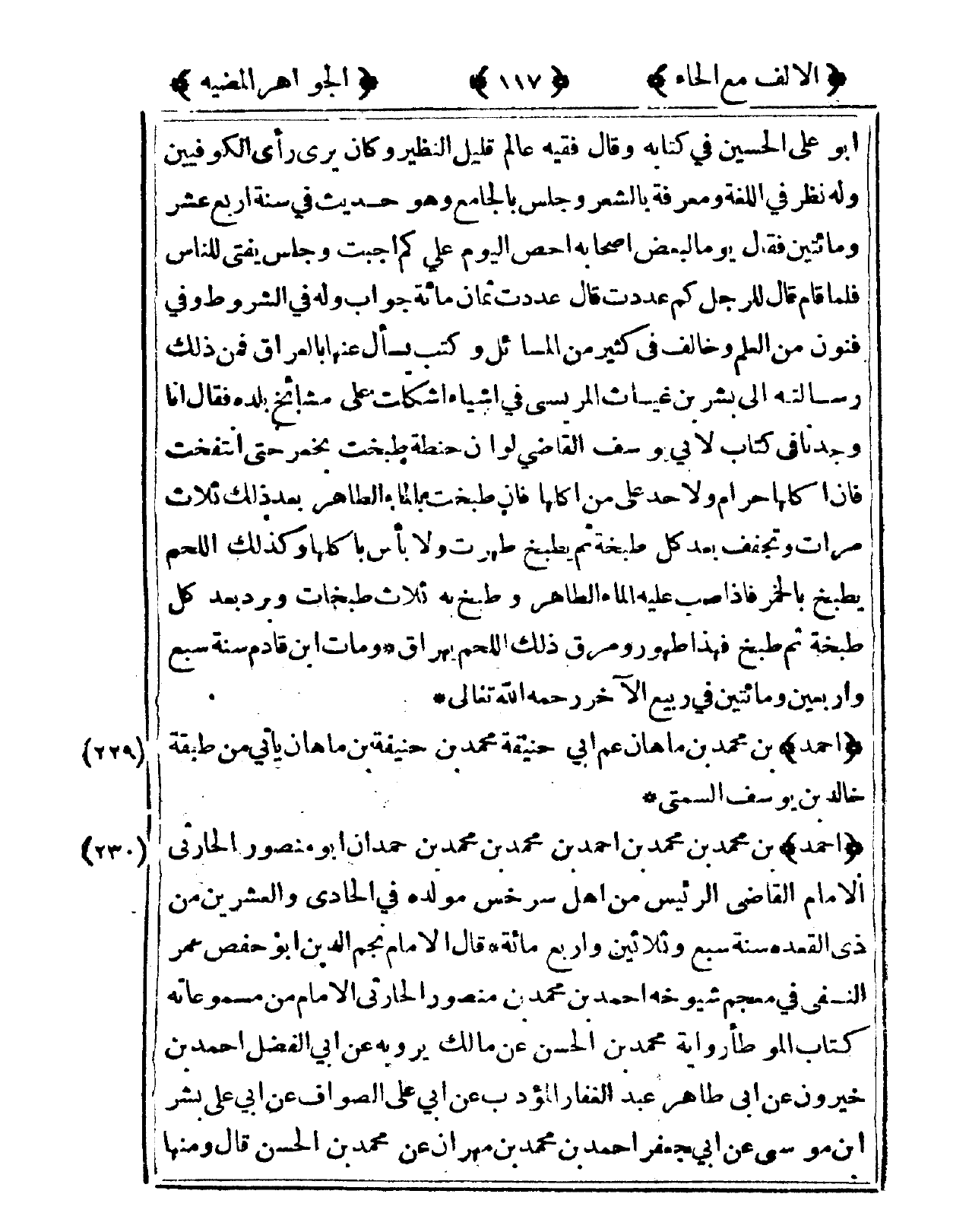 230 - أَحْمد بن مُحَمَّد بن مُحَمَّد بن أَحْمد بن مُحَمَّد بن مُحَمَّد بن حمدَان أَبُو مَنْصُور الْحَارِثِيّ الإِمَام القَاضِي الرئيس من أهل سرخس مولده فى الْحَادِي وَالْعِشْرين من ذى الْقعدَة سنة سبع وَثَلَاثِينَ وَأَرْبع مائَة قَالَ الإِمَام نجم الدّين أَبُو حَفْص عمر النَّسَفِيّ فى مُعْجم شُيُوخه أَحْمد بن مُحَمَّد بن مَنْصُور الْحَارِثِيّ الإِمَام من مسموعاته كتاب الْمُوَطَّأ رِوَايَة مُحَمَّد بن الْحسن عَن مَالك يرويهِ عَن أبي الْفضل أَحْمد بن خيرون عَن أبي طَاهِر عبد الْغفار الْمُؤَدب عَن أبي على الصَّواف عَن أبي عَليّ بشر ابْن مُوسَى عَن أبي جَعْفَر أَحْمد بن مُحَمَّد بن مهْرَان عَن مُحَمَّد بن الْحسن قَالَ وَمِنْهَا
